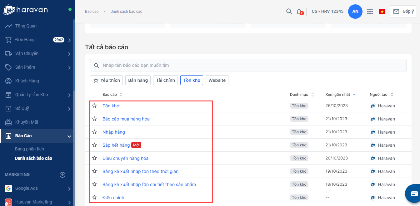 2. Chọn báo cáo bạn cần xem trong danh sách báo cáo tồn kho