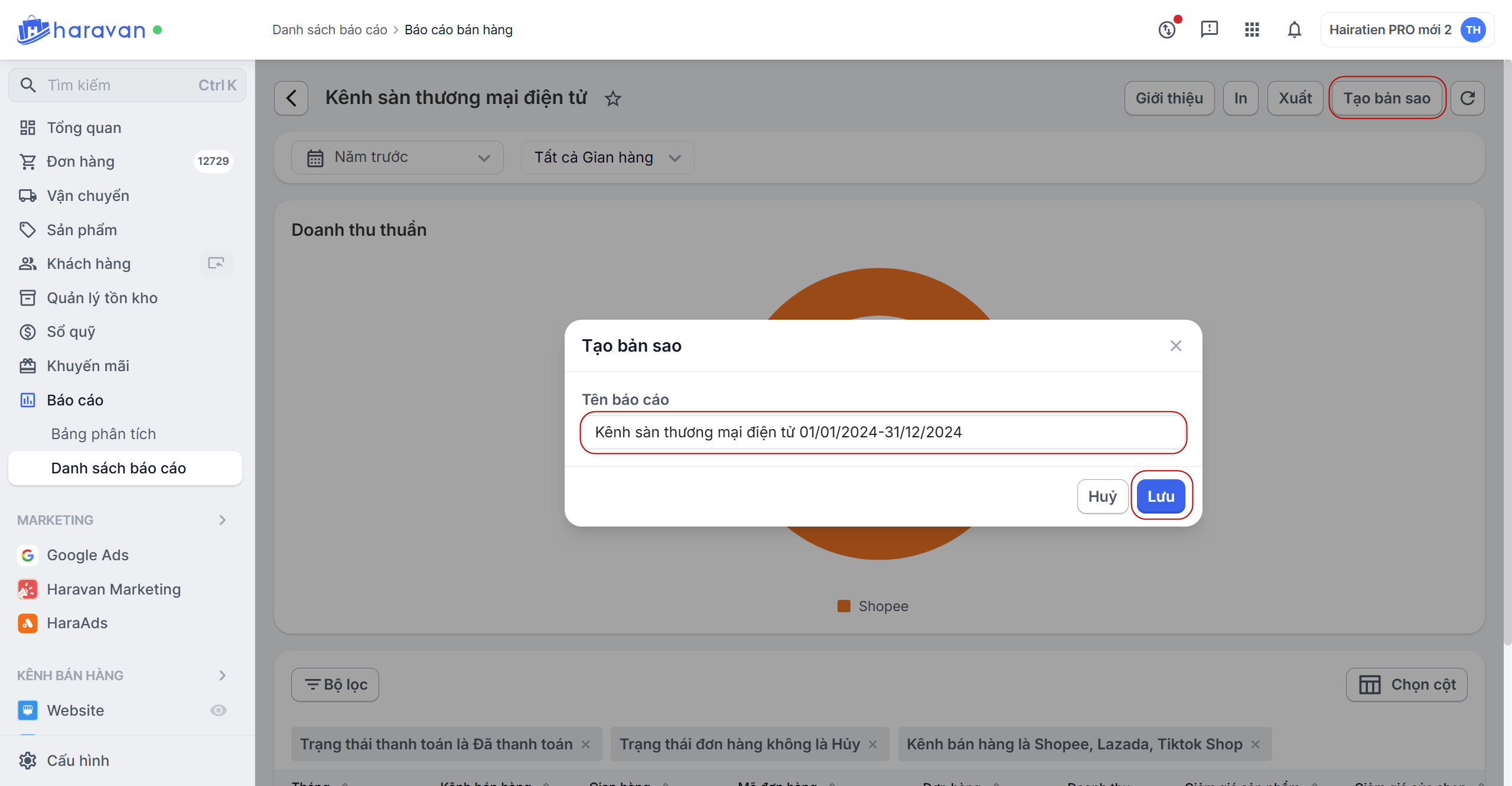 Tạo bản sao: Nhà bán hàng có thể sử dụng thao tác này như một thao tác lưu lại bản báo cáo với các điều kiện đã thiết lập để xem ngay mà không cần phải thêm điều kiện lọc lại hoặc thêm thông tin hiển thị. Nhà bán hàng chọn Tạo bản sao và đặt tên gợi nhớ cho báo cáo mới.