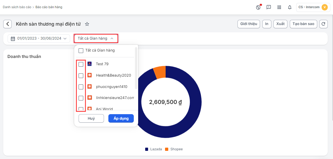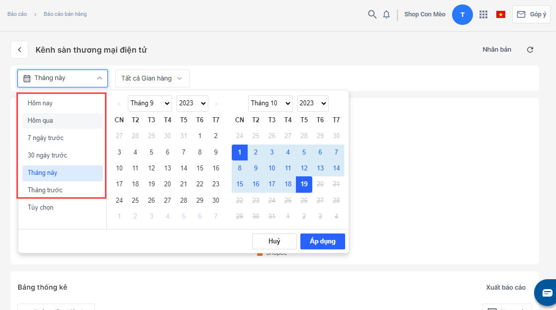 - Lọc báo cáo theo gian hàng: Nhà bán có thể chọn gian hàng muốn lọc xem báo cáo