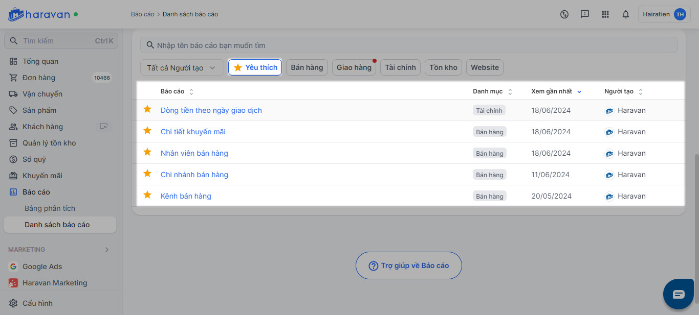 Ngoài ra, nhà bán cũng có thể đánh dấu yêu thích những báo cáo thường xuyên sử dụng để dễ dàng xem lại.
