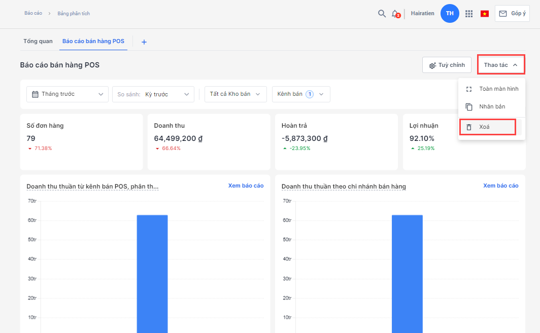 Để thực hiệnxóa bảng tổng quan, bạn chọn Thao tác -> chọn Xóa