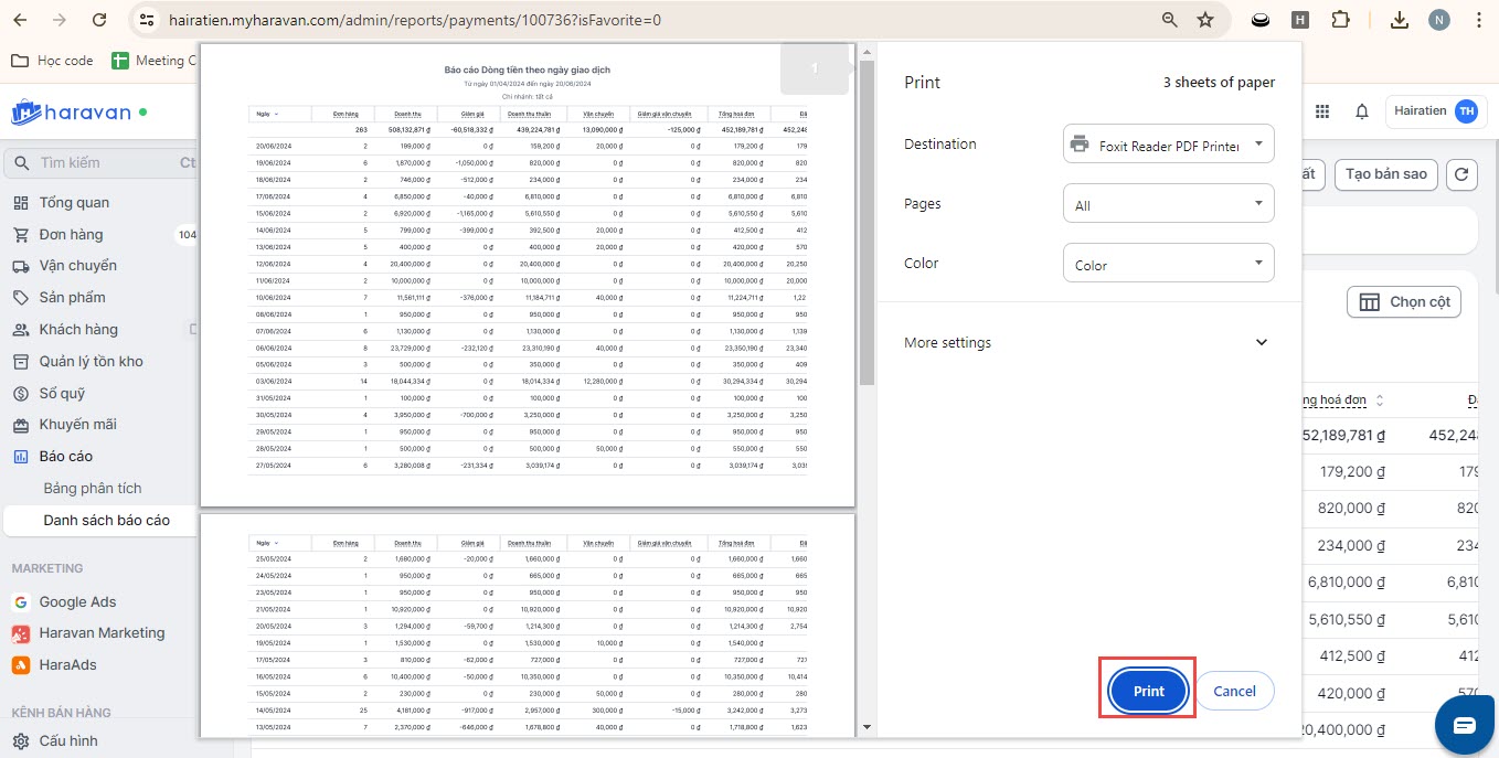 Haravan hỗ trợ nhà bán in báo cáo để dễ dàng thực hiện một số thao tác như in báo cáo kiểm kho, in báo cáo kiểm tra doanh thu bán hàng,...