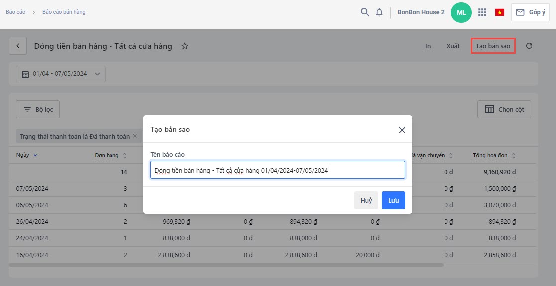 Đây là thao tác nhân bản, nhà bán hàng có thể sử dụng thao tác này để lưu lại bảng báo cáo với các điều kiện đã thiết lập. Nhà bán hàng chọn**Tạo bản sao, đặt tên cho bảng báo cáo nhân bản và chọn Lưu để hoàn tất.**