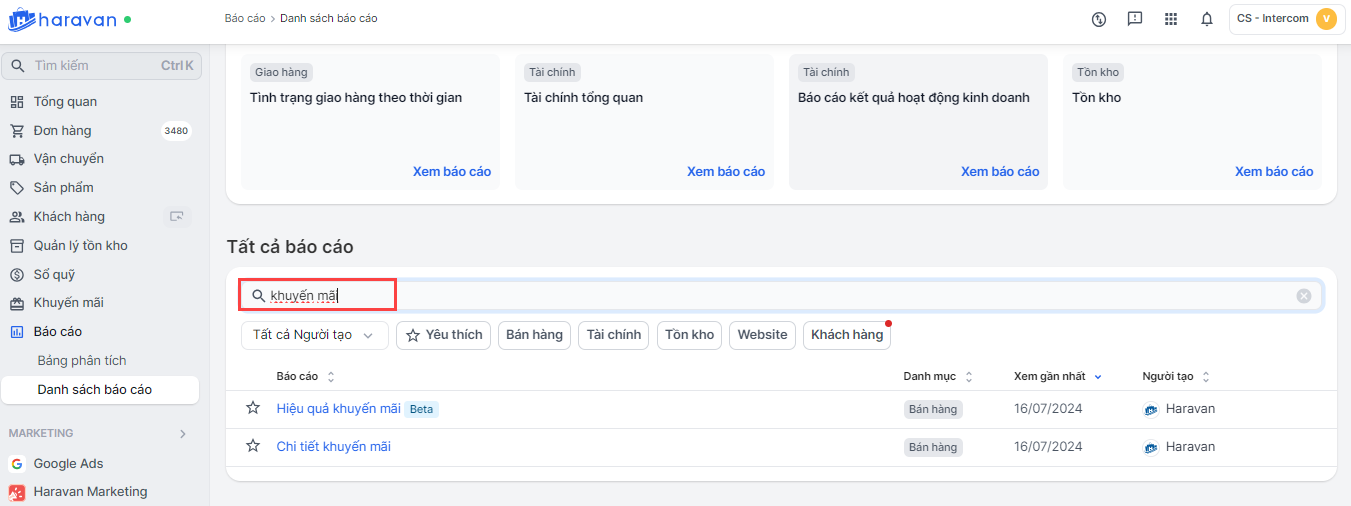Nhà bán hàng bấm chọn vào các tab phân loại báo cáo để tìm báo cáo muốn xem trong danh sách
