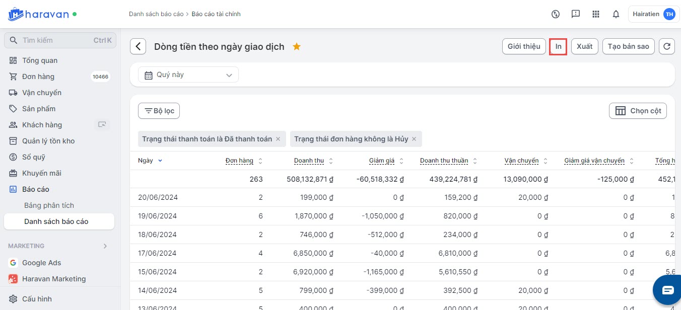 - Để thực hiện in, nhà bán vào trang chi tiết báo cáo -> chọn In