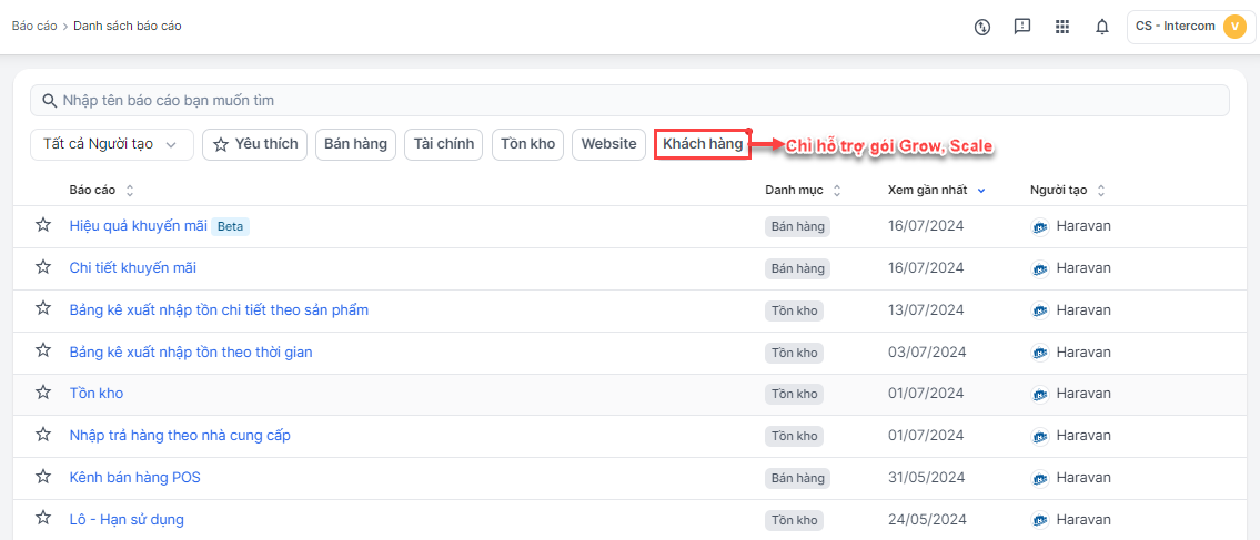 - Báo cáo Khách hàng (Chỉ hỗ trợ gói Grow, Scale)