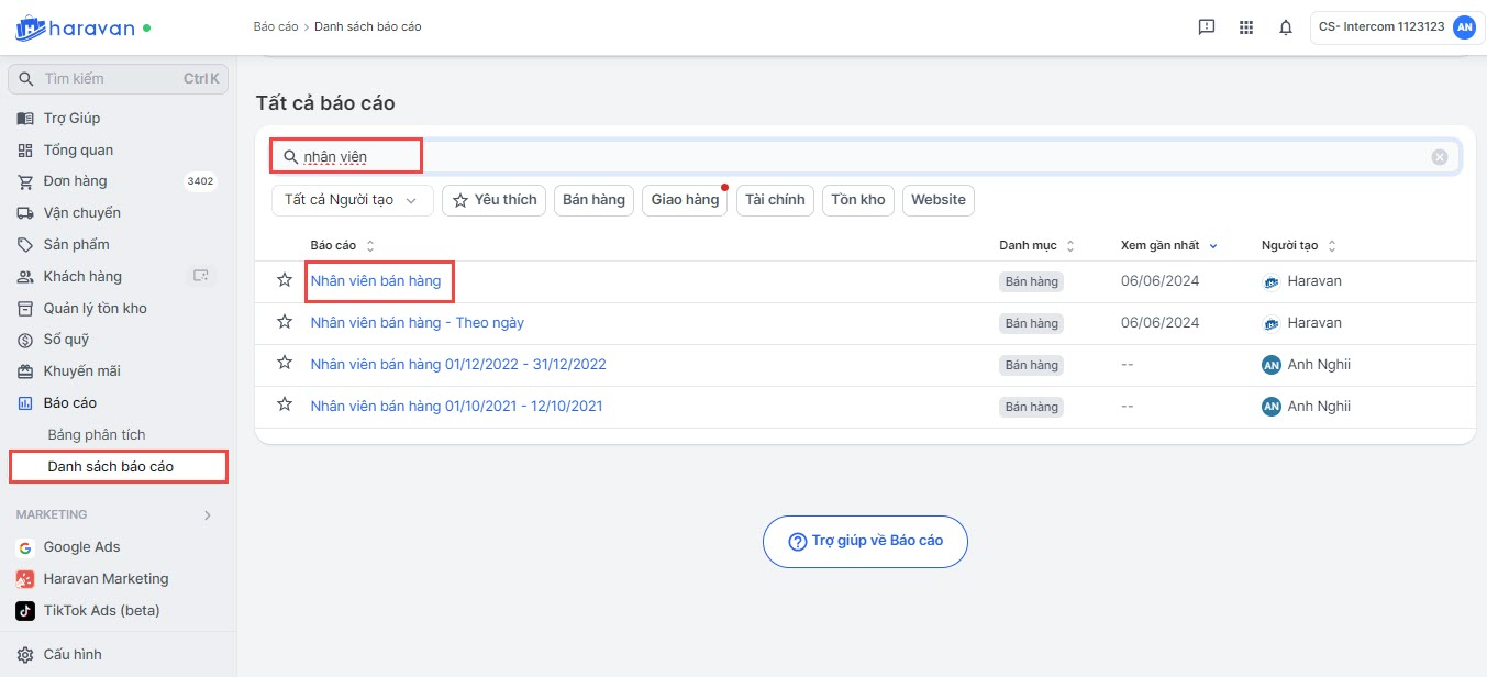 Nhà bán hàng vào mục Báo cáo, chọn Danh sách báo cáo. Trên thanh tìm kiếm, nhà bán hàngtìm từ khóa “nhân viên” và chọn báo cáo Nhân viên bán hàng.