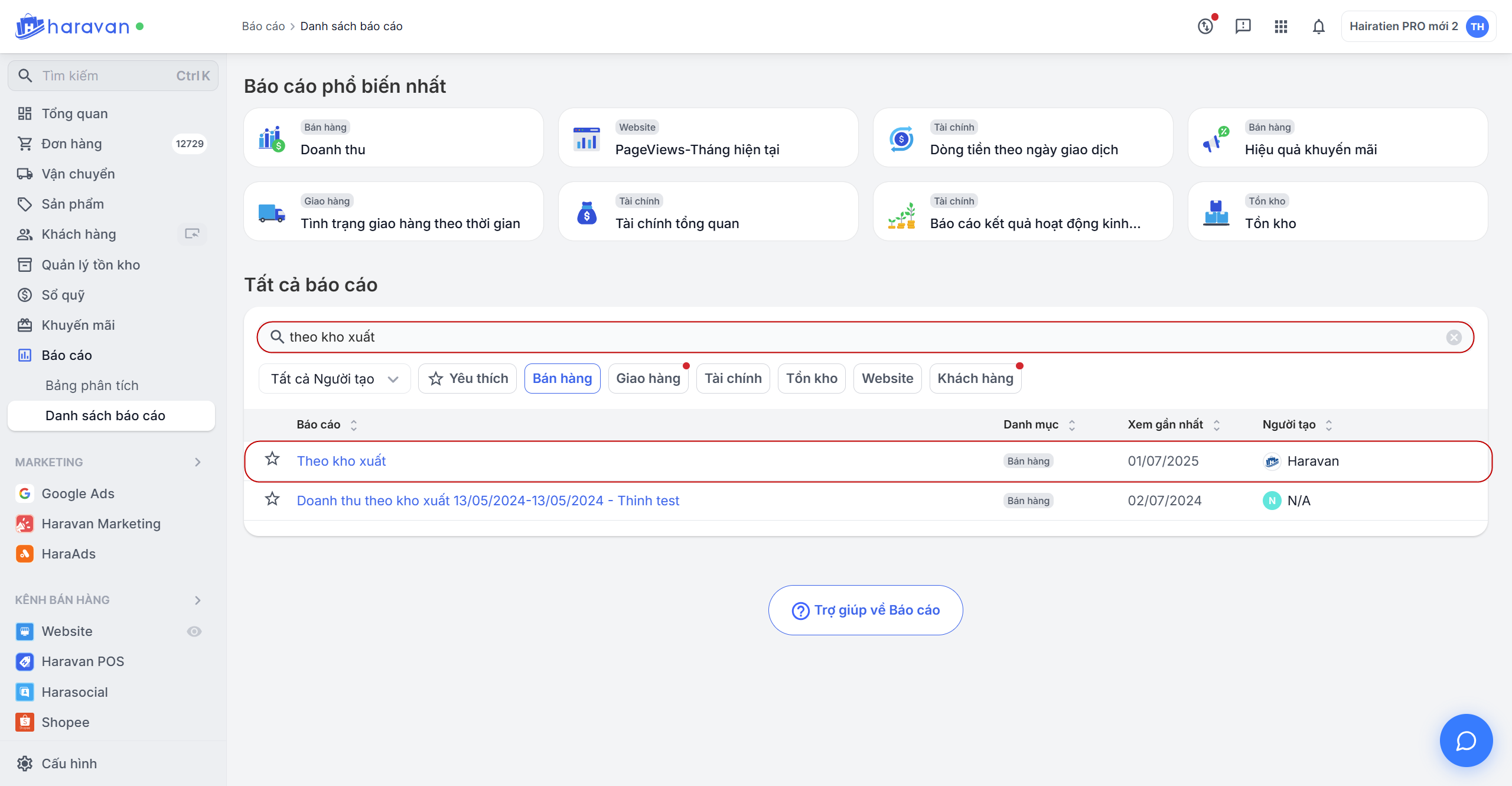Để xem báo cáo doanh thu theo kho xuất, nhà bán hàng vào mục Danh sách báo cáo, nhập “Theo kho xuất” vào ô tìm kiếm.