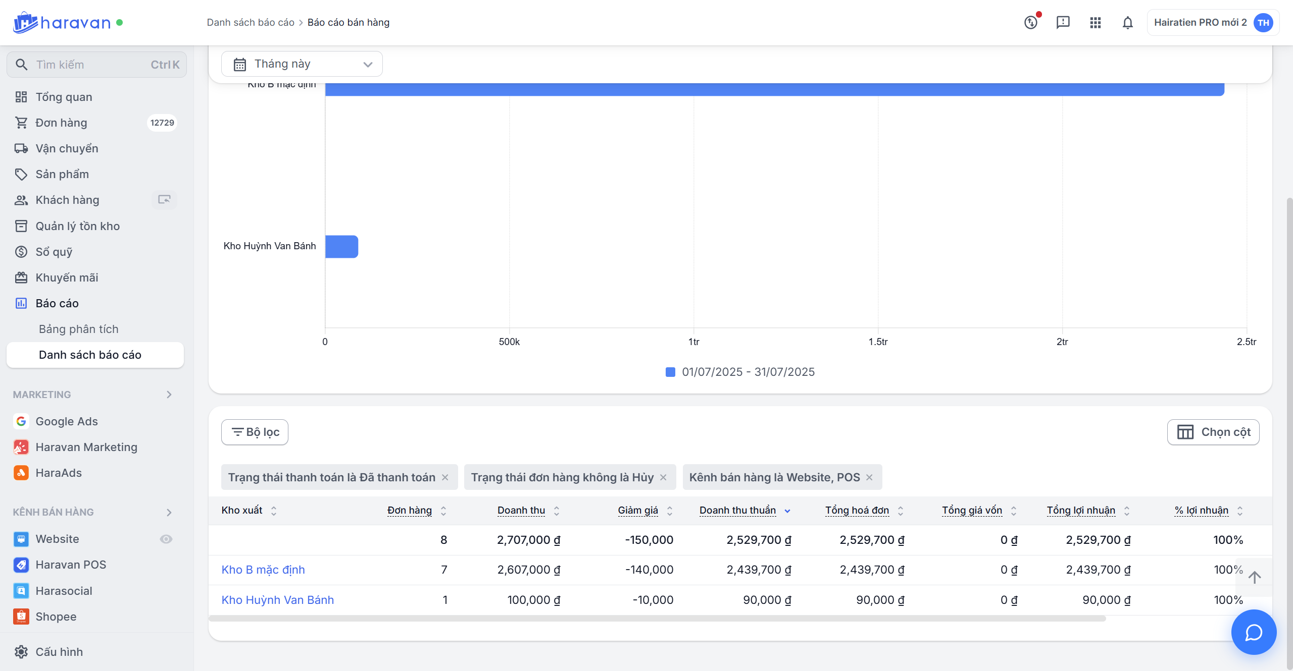 - Hướng dẫn xem báo cáo doanh thu theo kho xuất