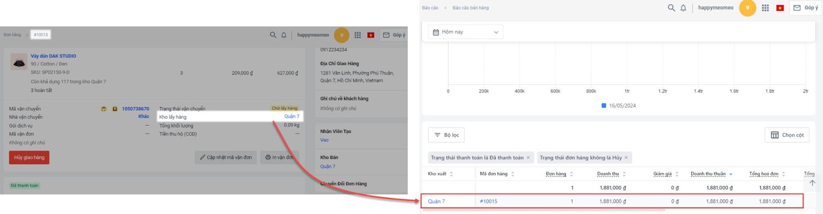Bộ lọc thời gian của báo cáo sẽ lọc theo ngày đặt hàng của đơn và chỉ lọc các đơn đã có thông tin kho xuất (dù đơn đã xuất kho hay chưa). Ví dụ có 2 đơn hàng được đặt trong ngày, nhưng lọc báo cáo chỉ thấy 1 đơn hàng dù điều kiện lọc đã trùng khớp với thông tin đơn hàng.
