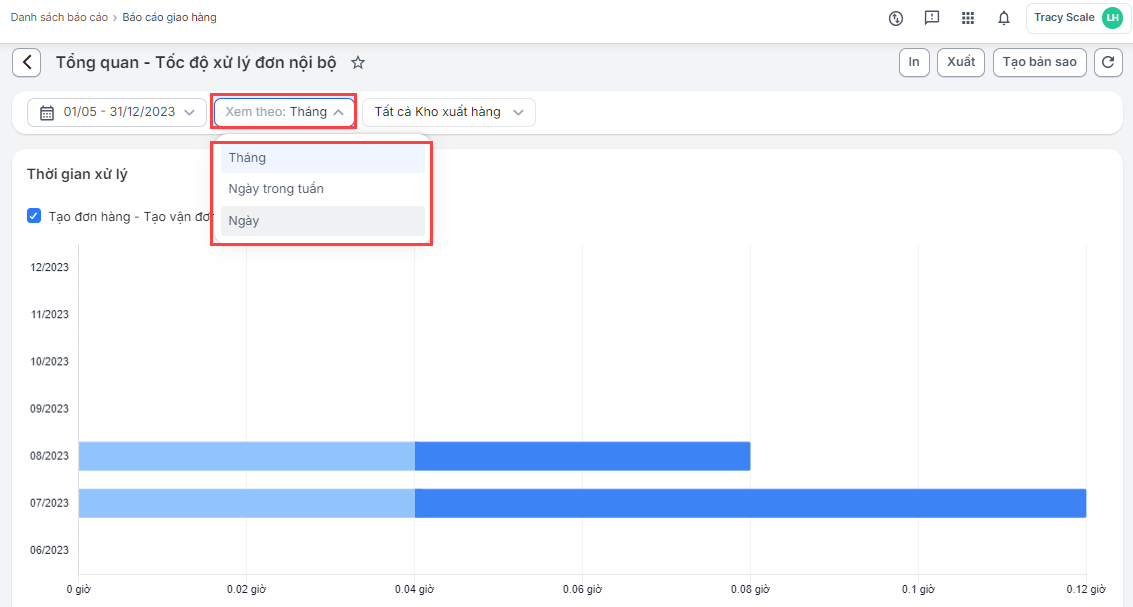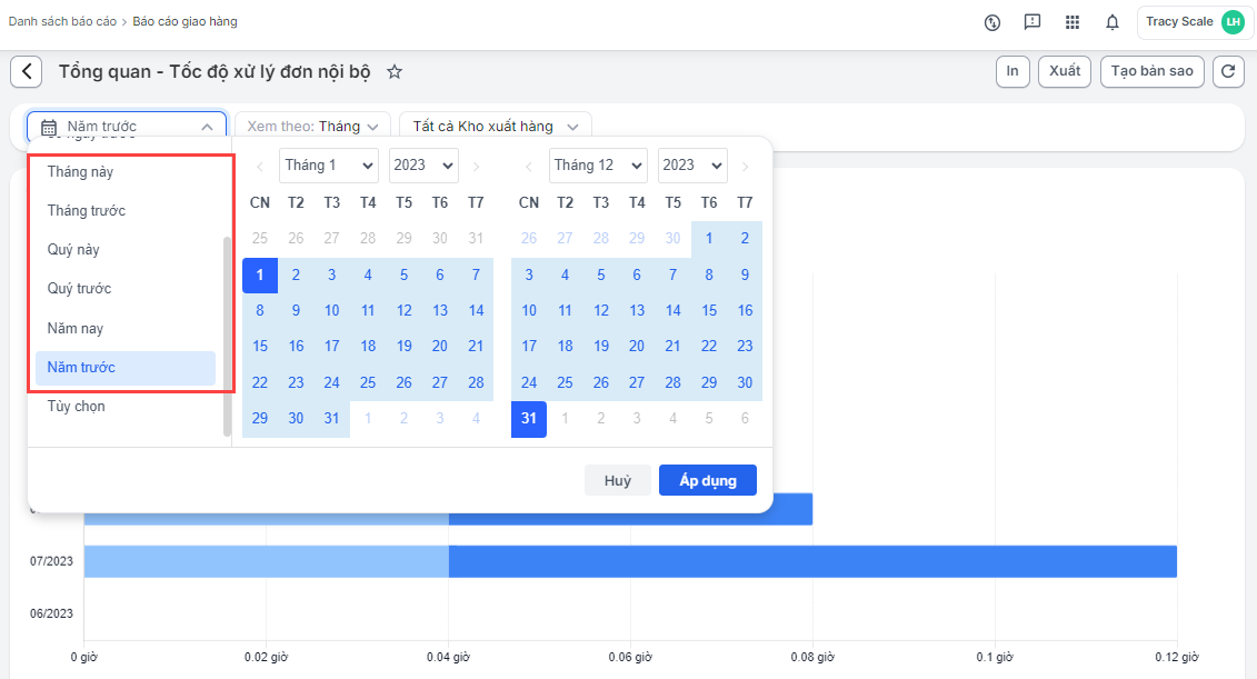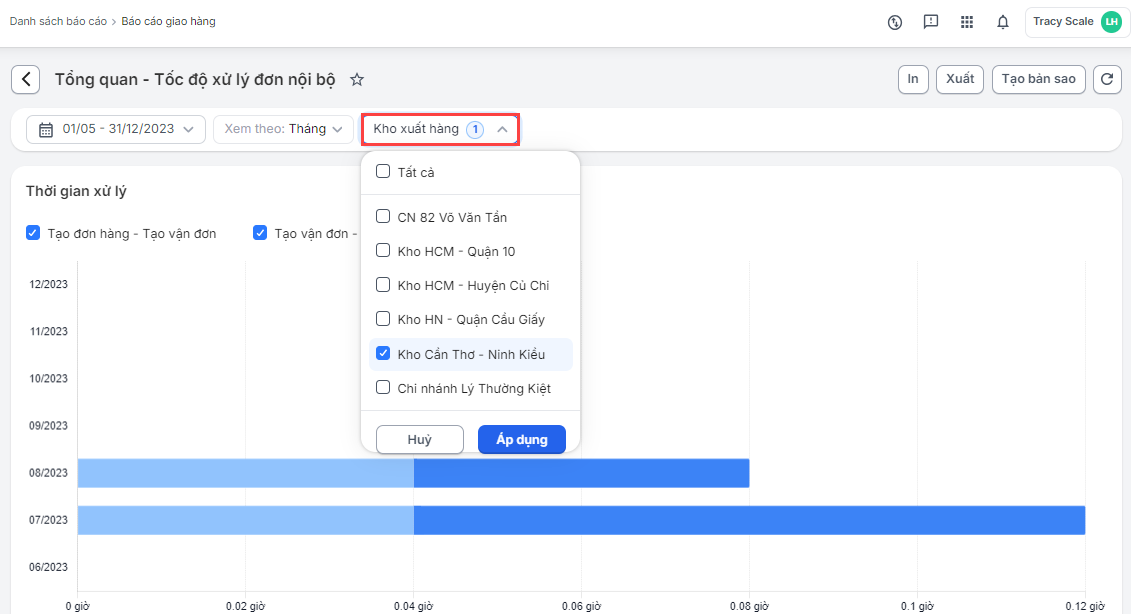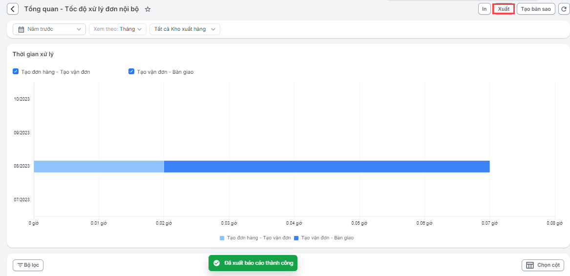 Báo cáo về tốc độ xử lý đơn nội bộ sẽ cung cấp thông tin tổng quan về tốc độ xử lý tại các bước trong quá trình xử lý đơn hàng theo từng kho hàng. Báo cáo cũng sẽ cung cấp biểu đồ cột để so sánh tốc độ xử lý đơn hàng giữa các ngày hoặc tháng khác nhau.