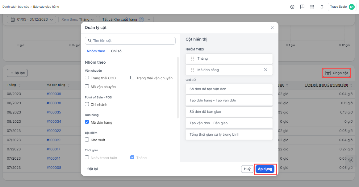 - Để xem chi tiết về dữ liệu vận đơn như Mã đơn hàng, trạng thái COD, trạng thái vận chuyển của đơn,..., nhà bán hàng vào Chọn cột và thực hiện thêm các thông tin -> chọn Áp dụng