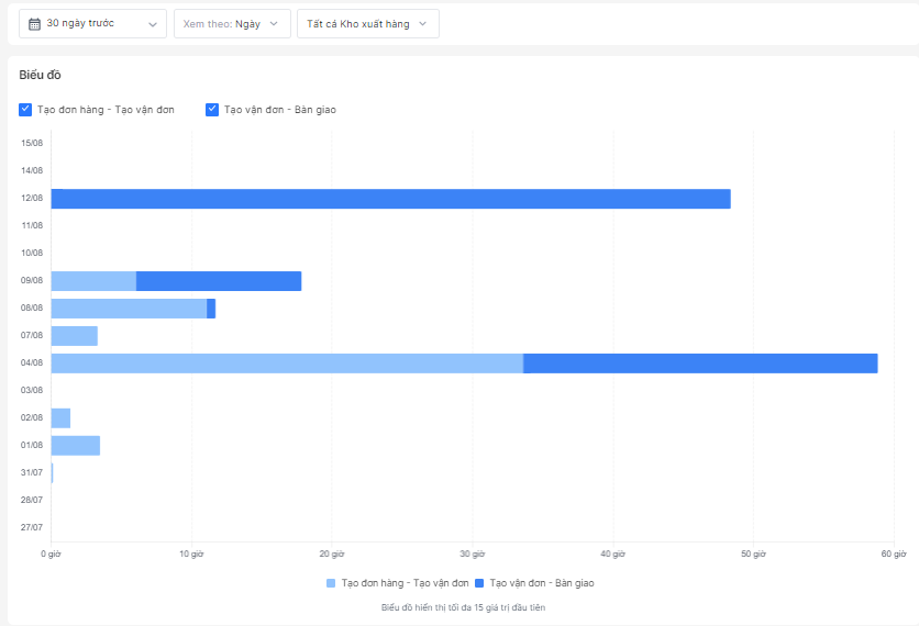 - Theo Ngày: Biểu đồ chỉ hiện thị 15 ngày đầu tiên trong khoảng thời gian lọc báo cáo. Ví dụ: bạn lọc thời gian 30 ngày trước và chọn Xem theo Ngày, biểu đồ chỉ hiển thị từ ngày 27/07 đến ngày 01/08