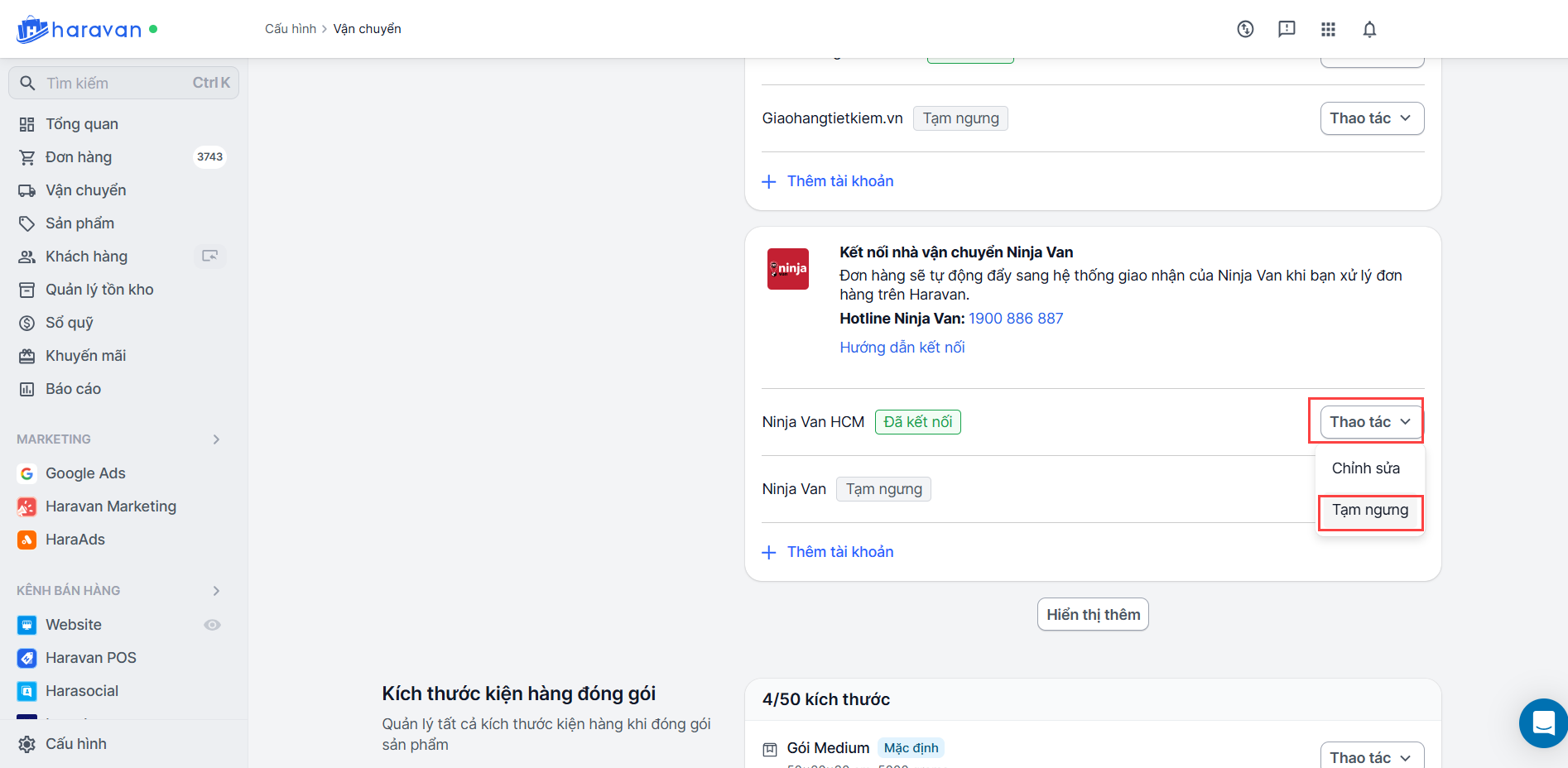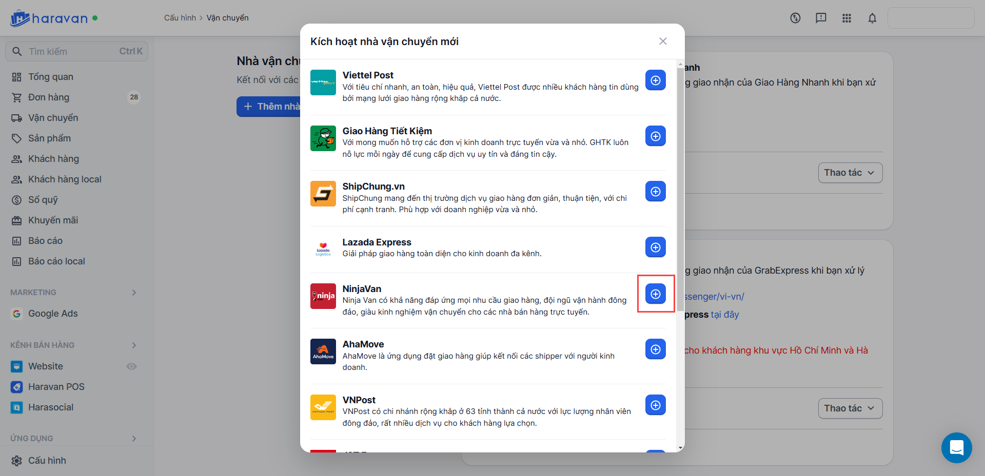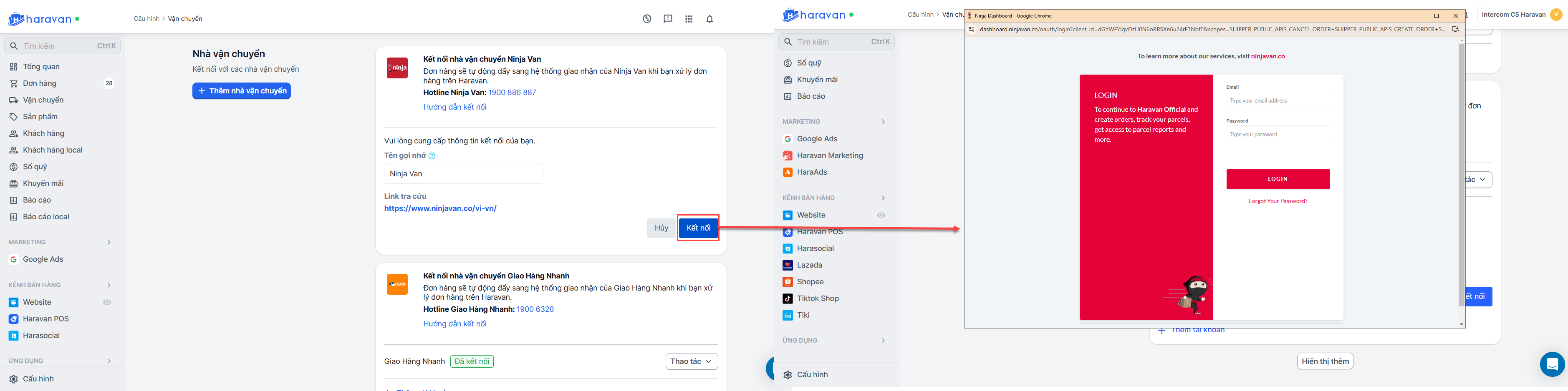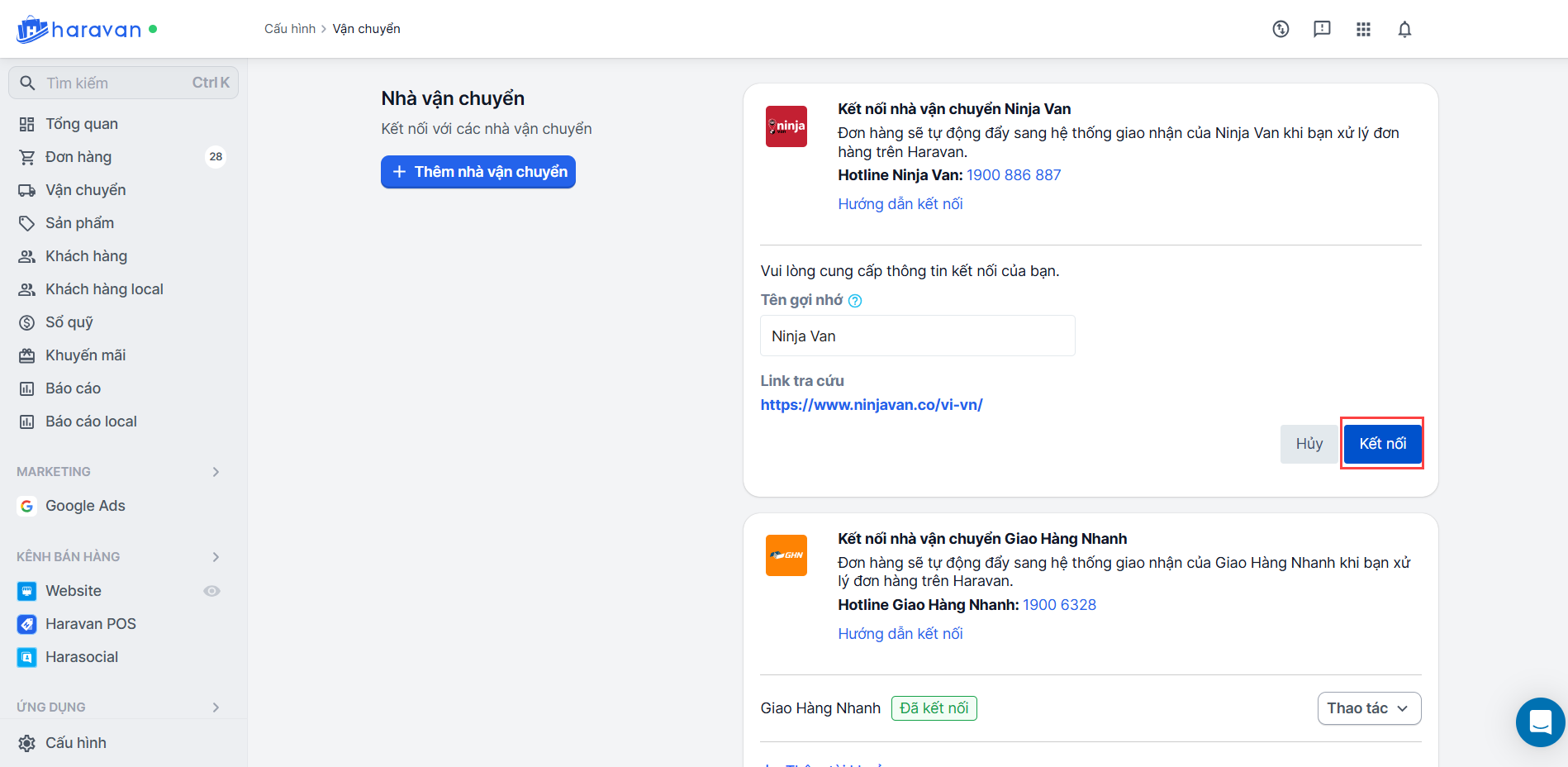 Hướng dẫn kết nối nhà vận chuyển NinjaVan trên Haravan