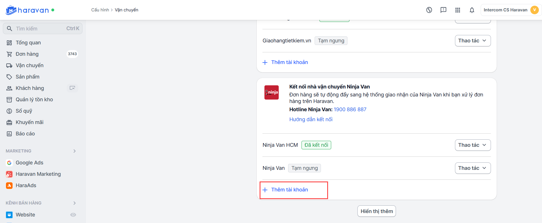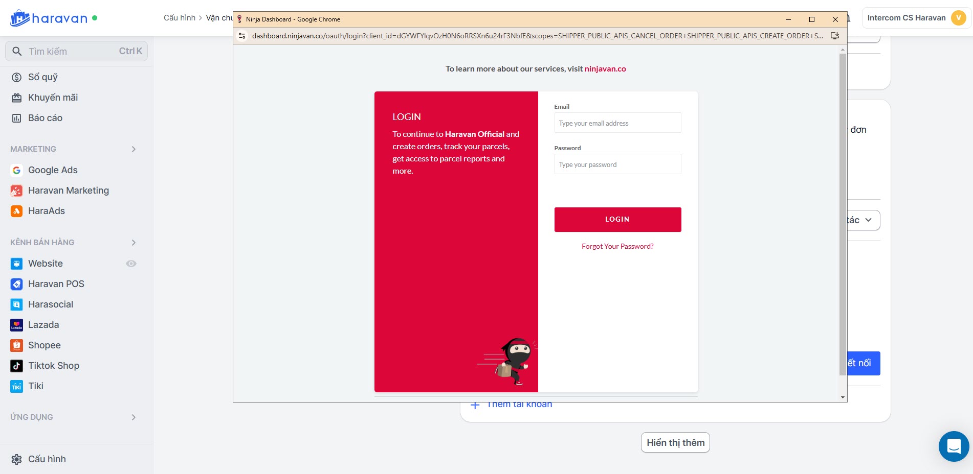 Kết nối thêm tài khoản Ninja Van vào trang quản trị MyHaravan