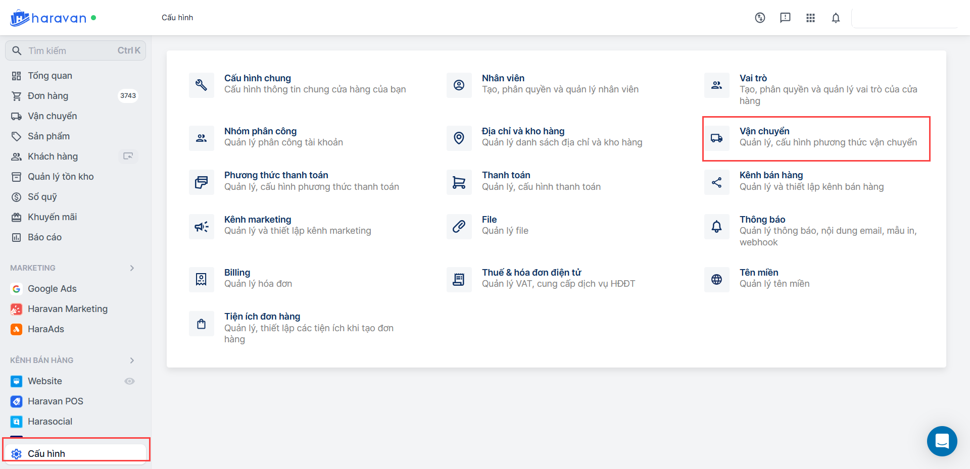 - Tại trang quản trị Haravan, vào mục Cấu hình → Vận chuyển