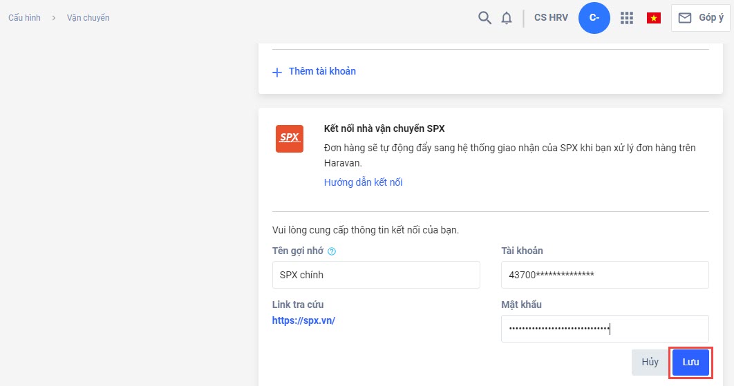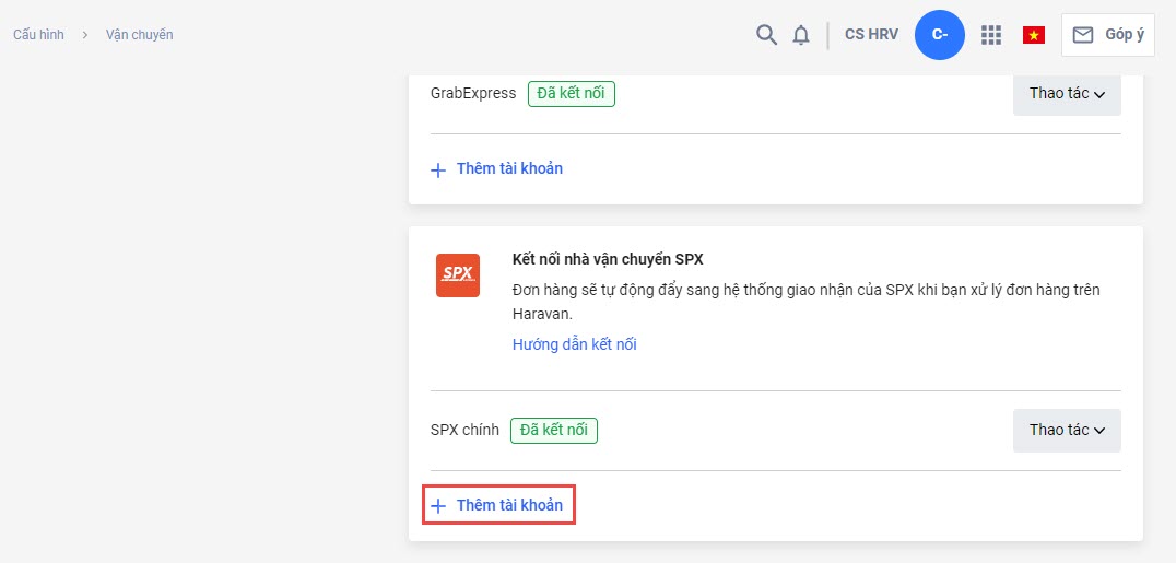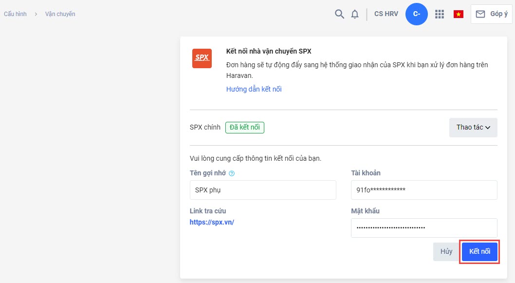Kết nối thêm tài khoản SPX vào trang quản trị MyHaravan