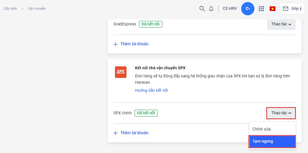 - Tạm ngưng kết nối đơn vị vận chuyển SPX