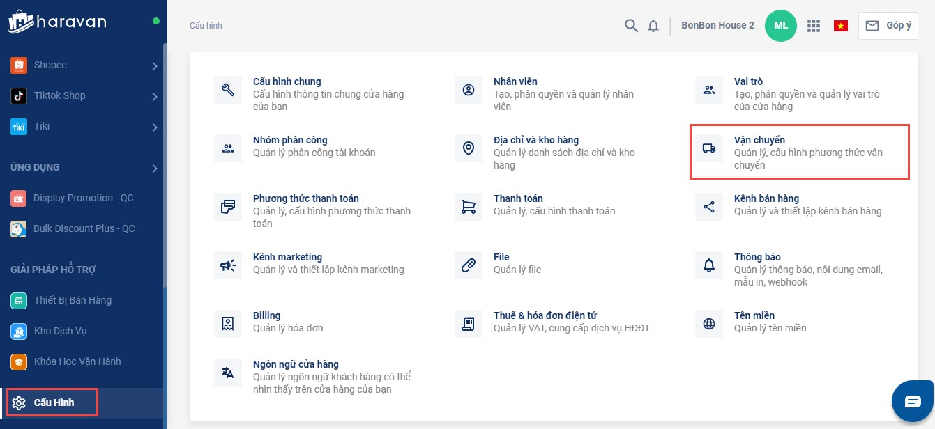 Bước 3: Tại trang quản trị MyHaravan, bạn chọn mục Cấu hình và chọn Vận chuyển.