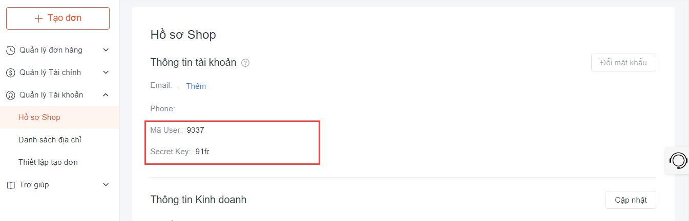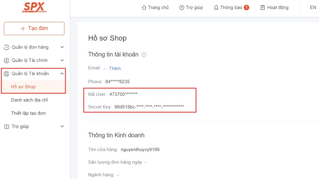 Bước 2: Khi đã tạo tài khoản thành công, bạn truy cập vào trang quản lý SPX , chọn mục Quản lý tài khoản - Hồ sơ Shop. Tại đây, bạn copy 2 thông tin: Mã user và Secret Key.