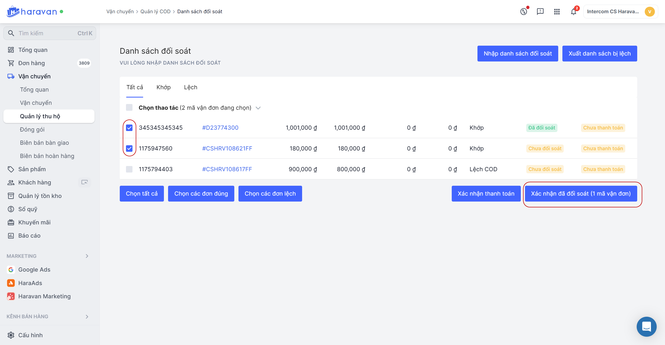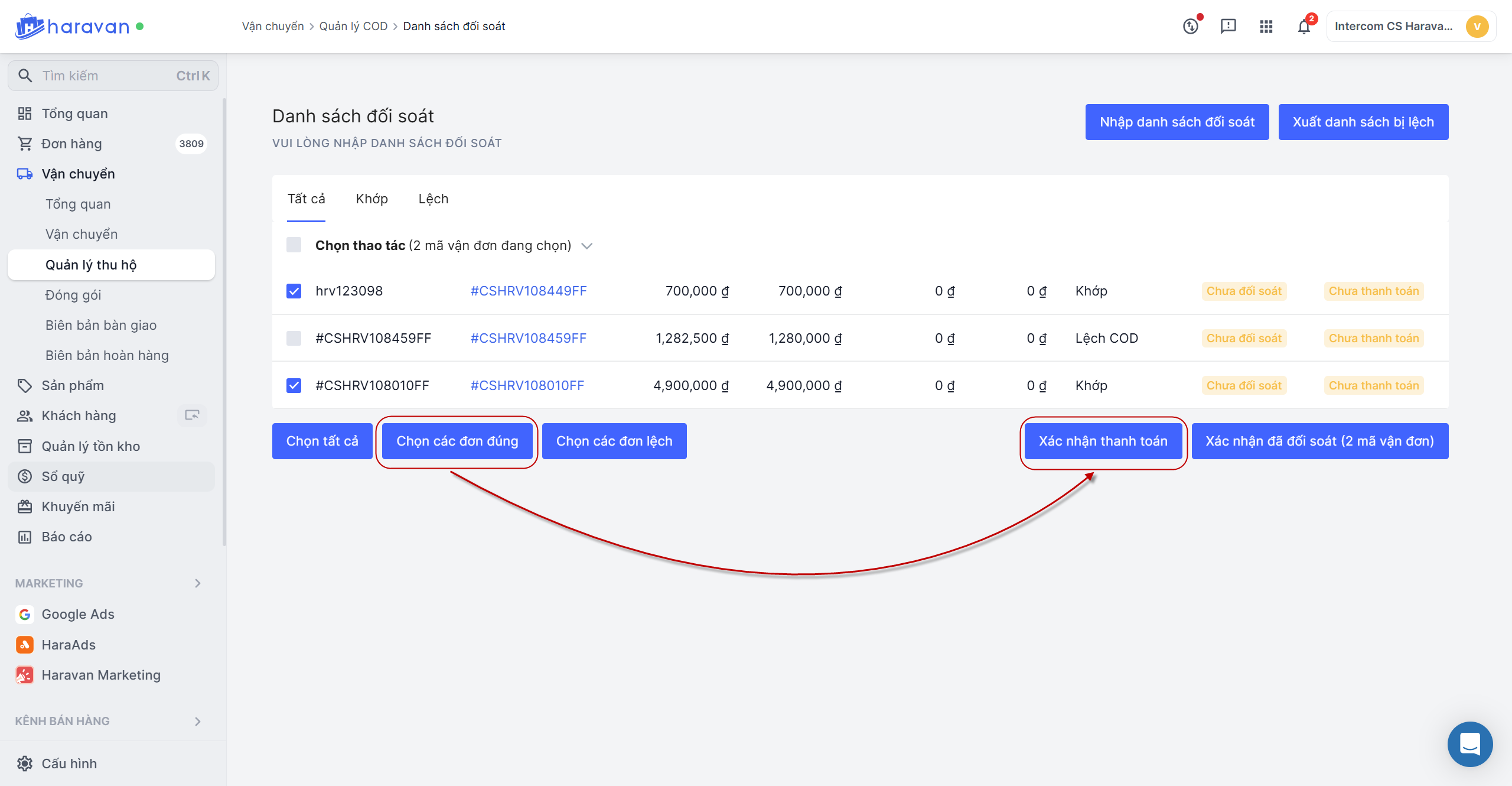 5. Thực hiện C**họn các đơn đúng để **Xác nhận đã đối soát**