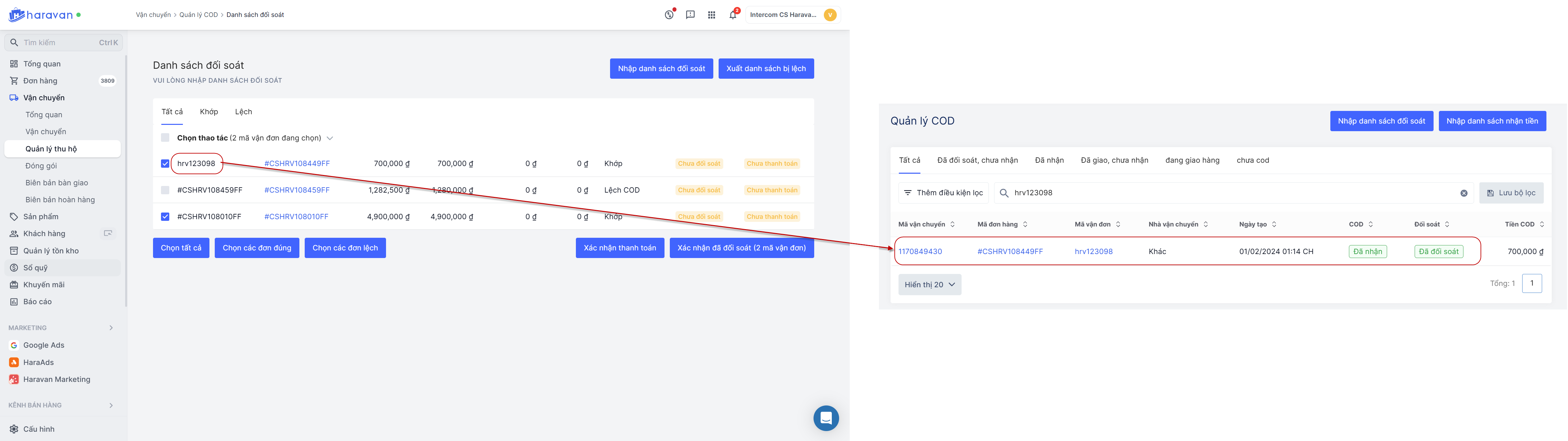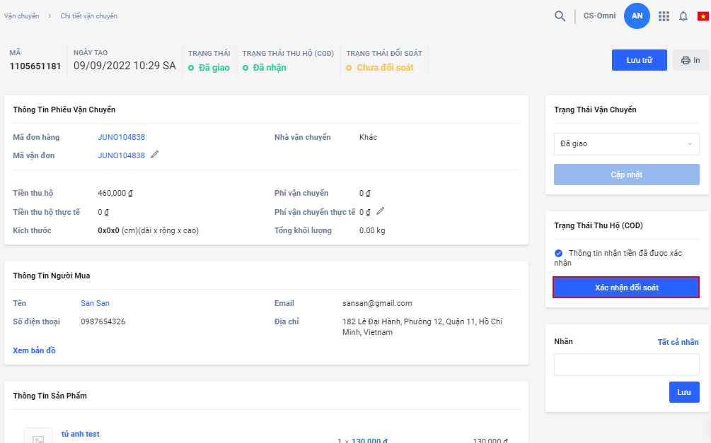 Trang quản trị -> Chọn đơn hàng cần xác nhận đối soát