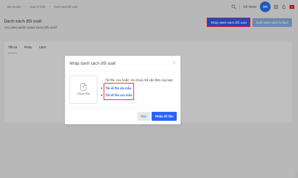 - Chọn Nhập danh sách đối soát -> Chọn Tải về file mẫu