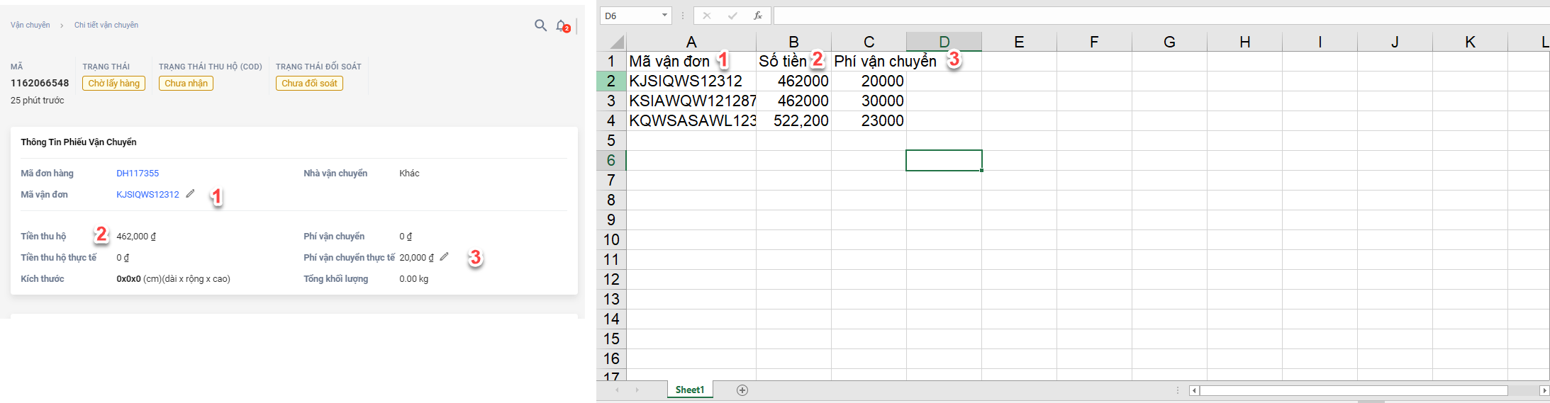- Cột Mã đơn hàng = Cột mã vận đơn của đơn vị vận chuyển