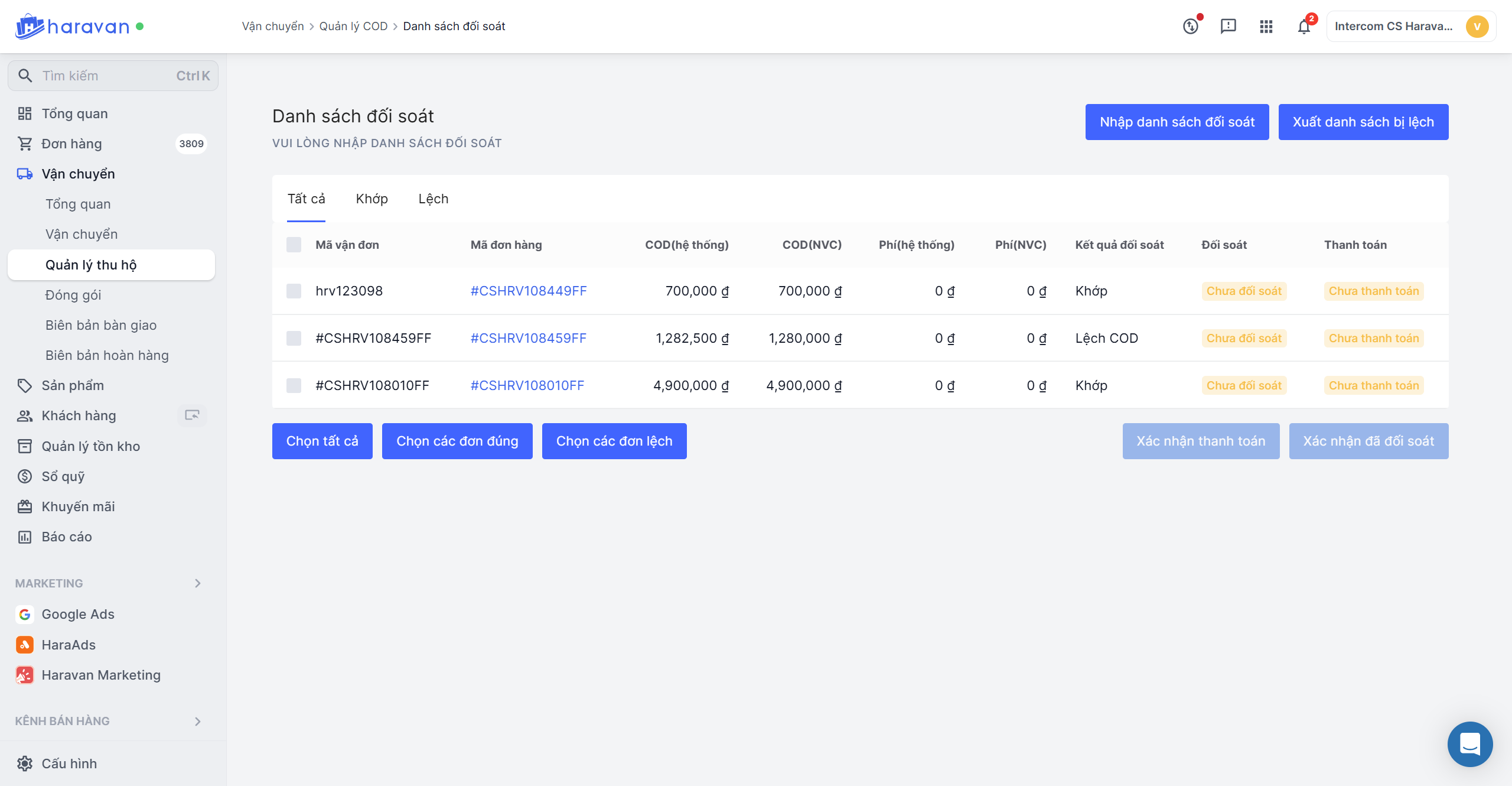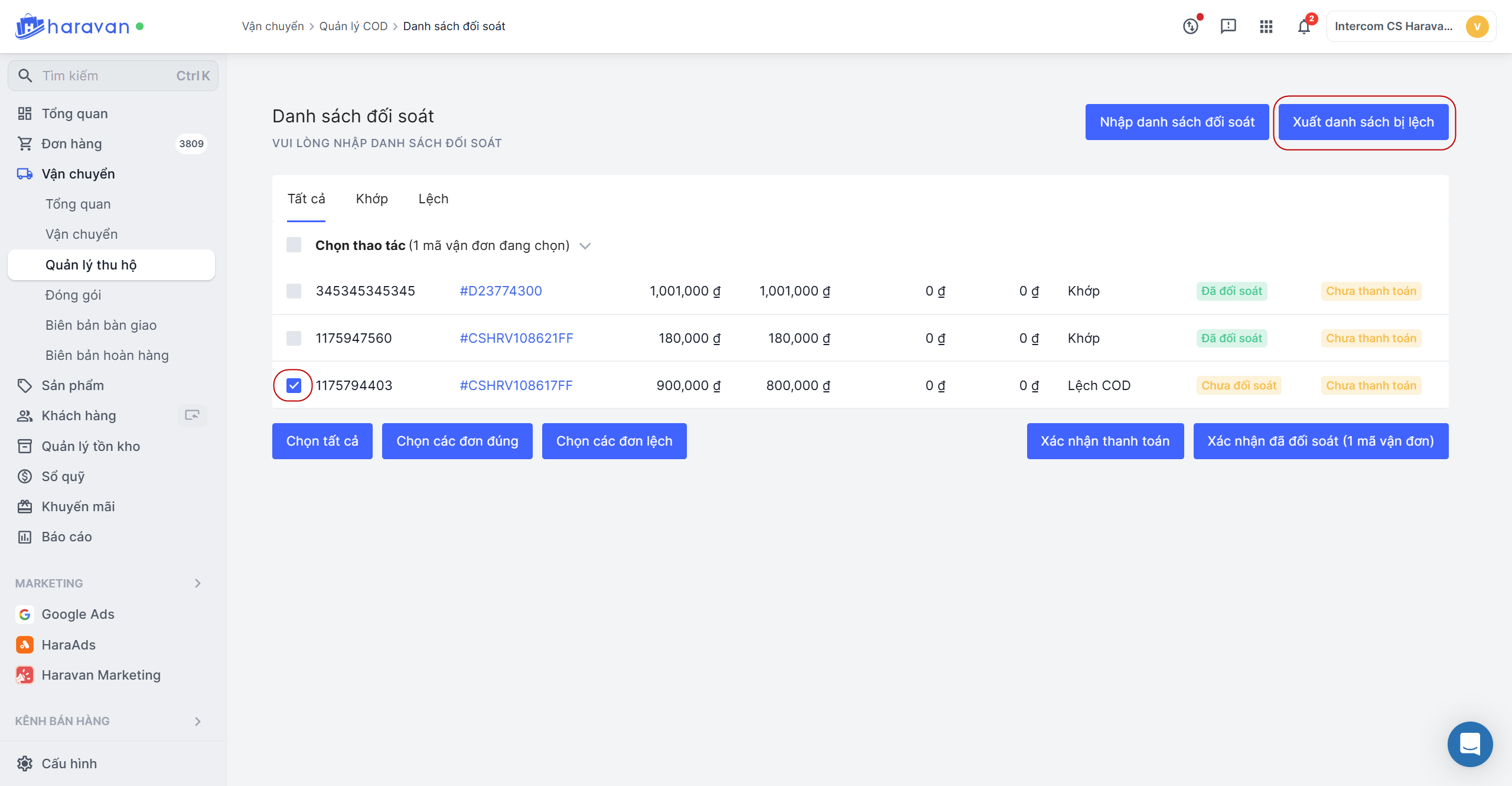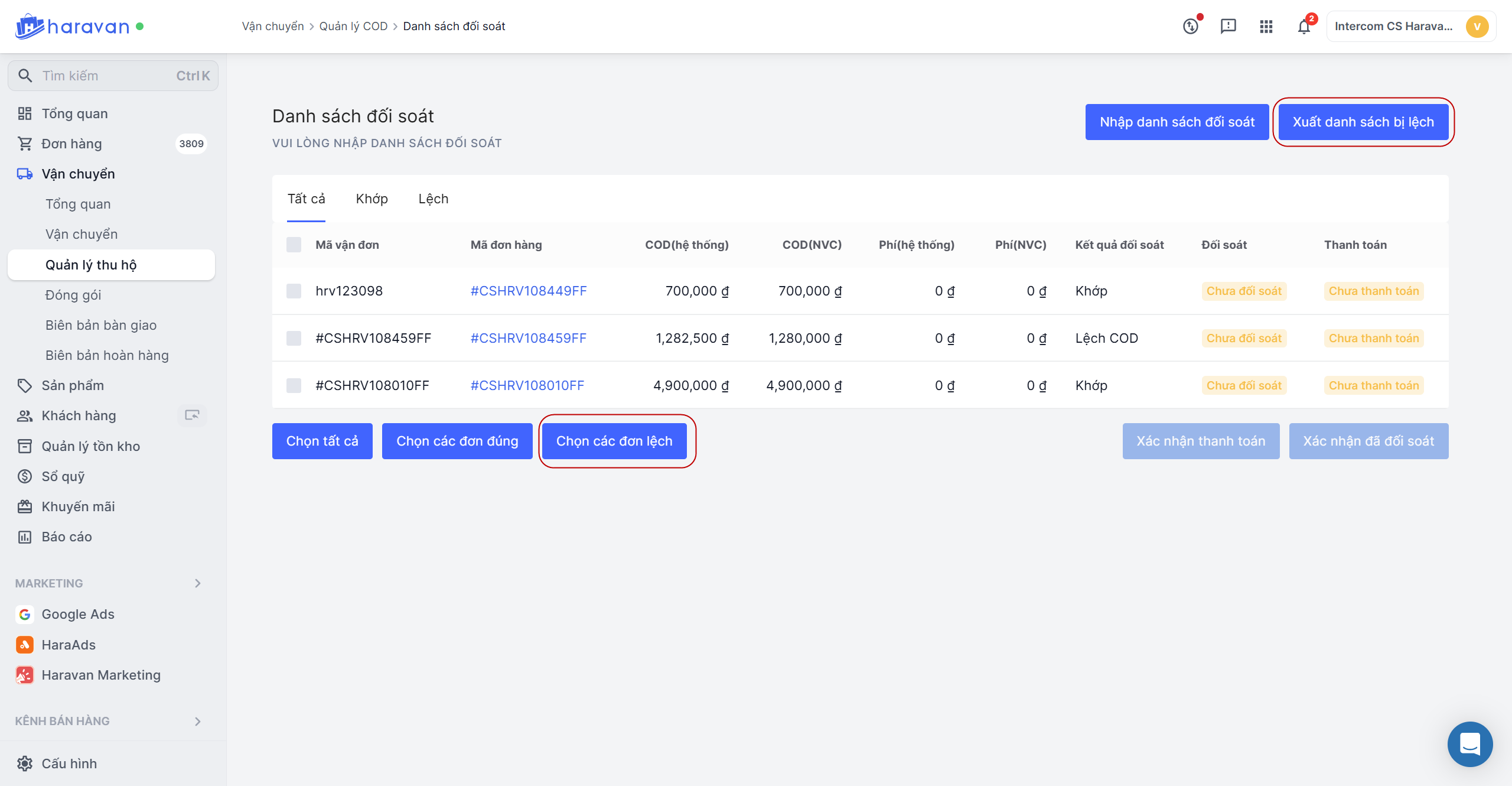 Chọn các đơn lệch -> Xuất danh sách các đơn bị lệch để bạn có thể làm việc lại với nhà vận chuyển