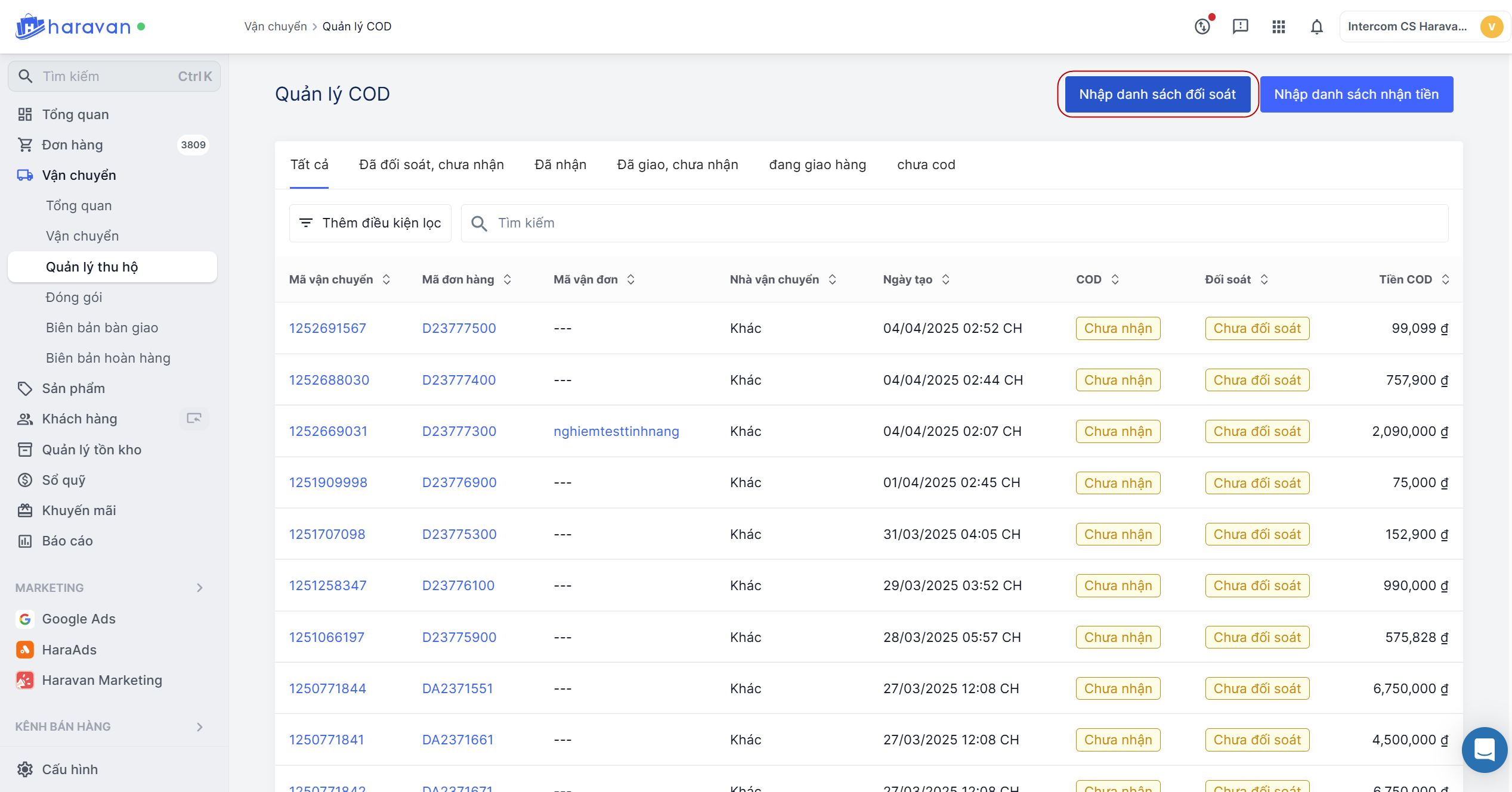 Bước 1. Vào menu Vận chuyển > Quản lý thu hộ > chọn Nhập danh sách đối soát