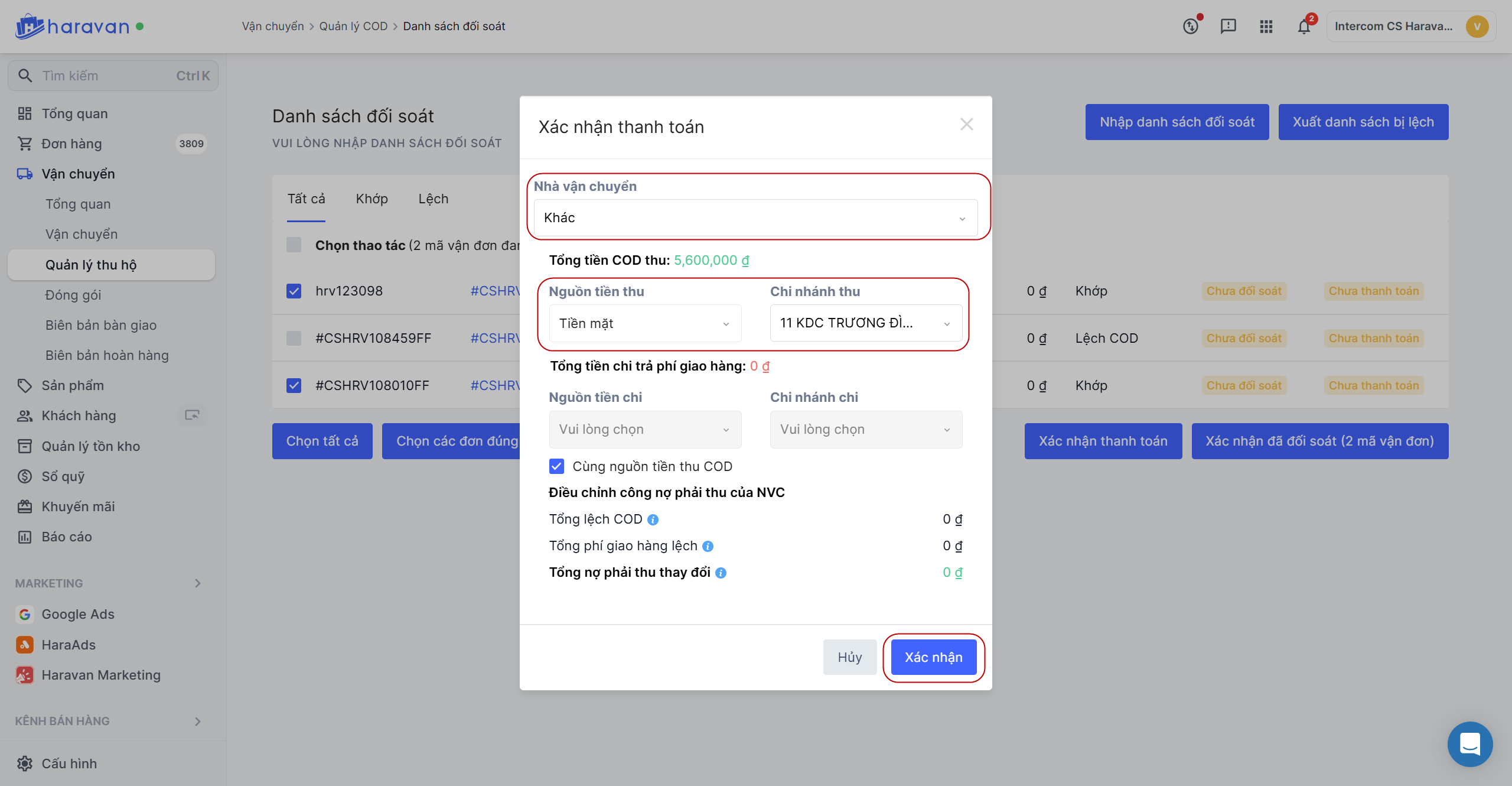 Bước 8: Chọn các đơn đúng và Xác nhận thanh toán. Thao tác này sẽ thanh toán công nợ nhà vận chuyển.