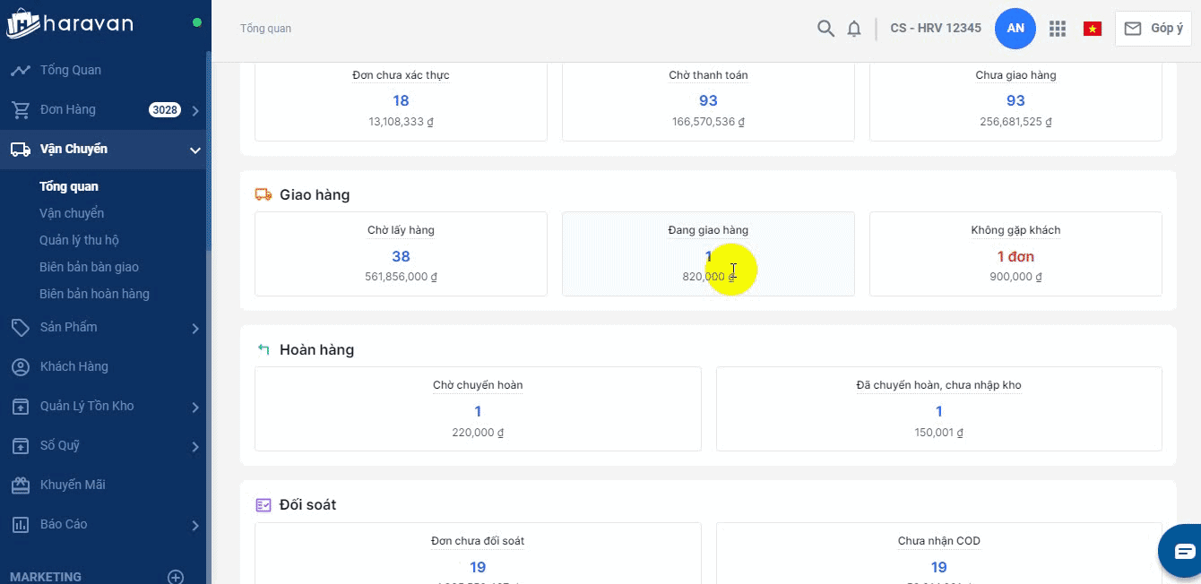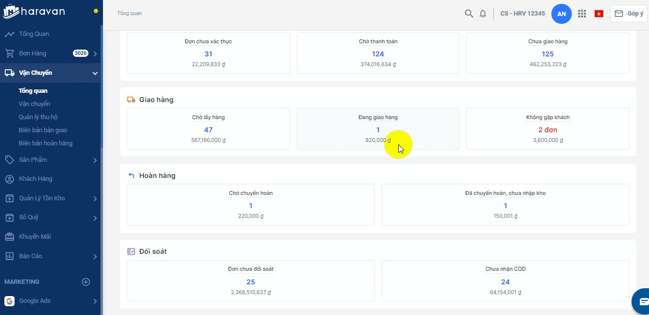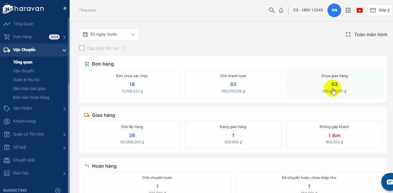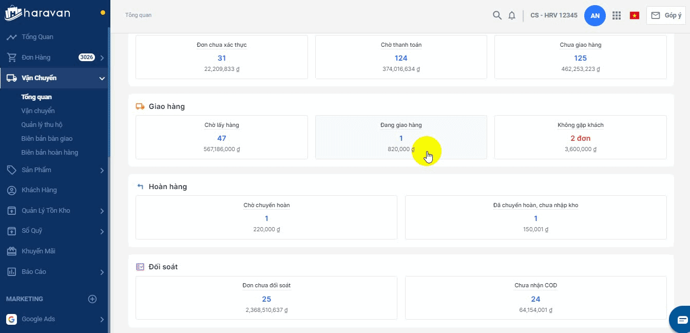 - Để xem chi tiết, bạn chọn vào mục đơn chưa giao hàng là sẽ điều hướng đến danh sách đơn hàng.