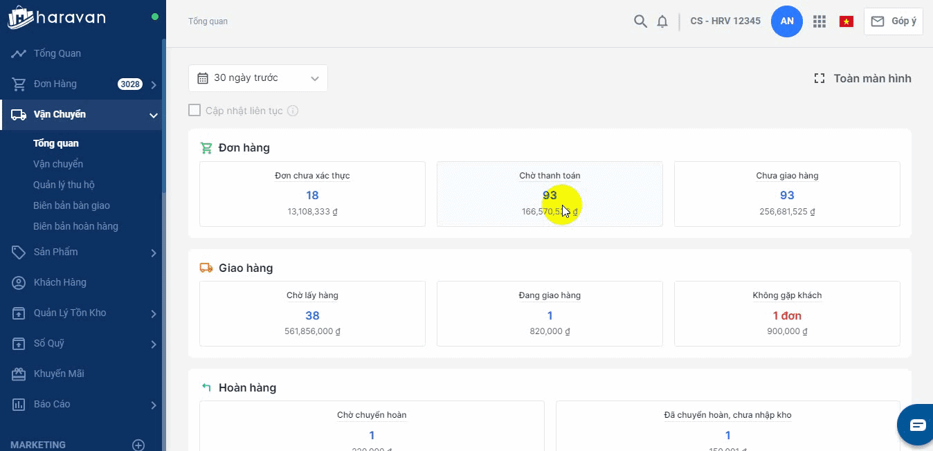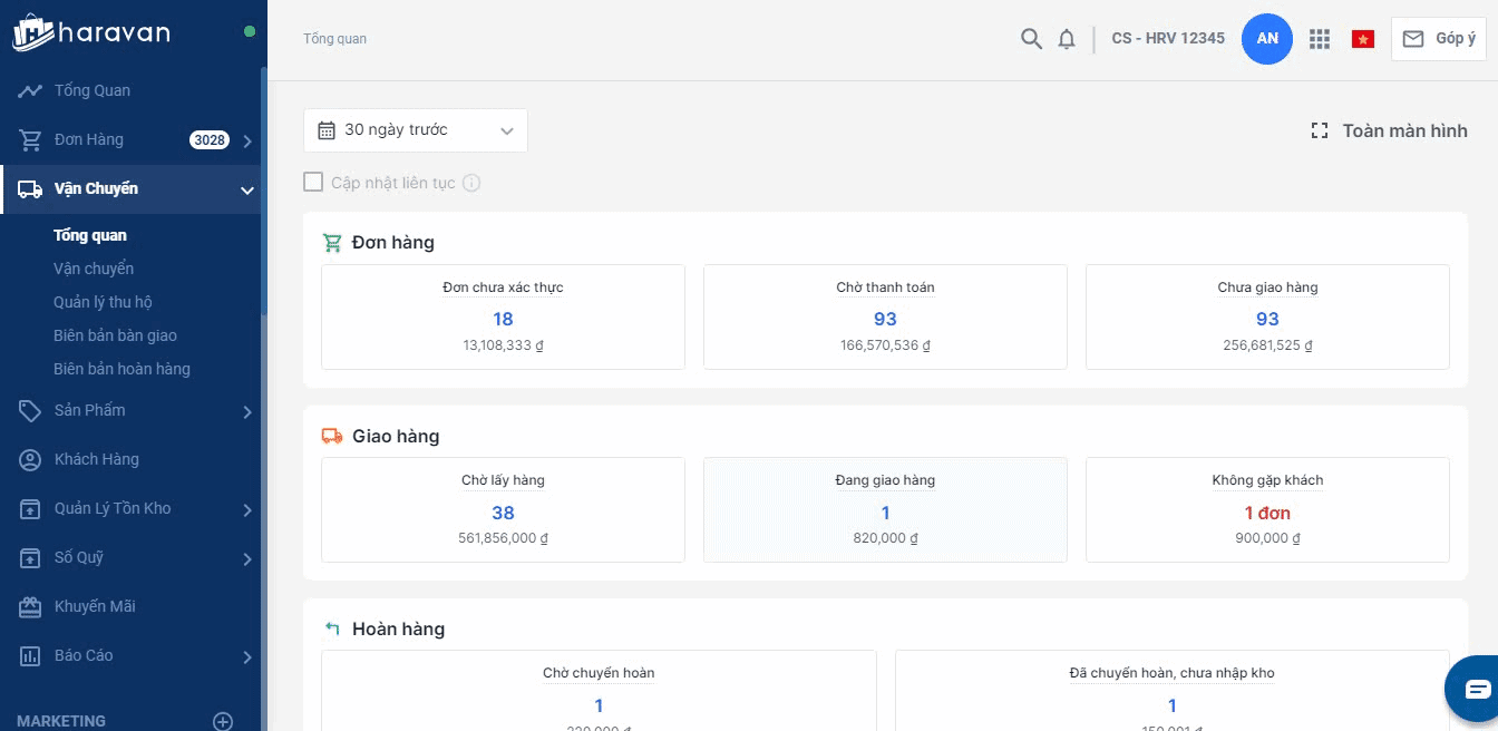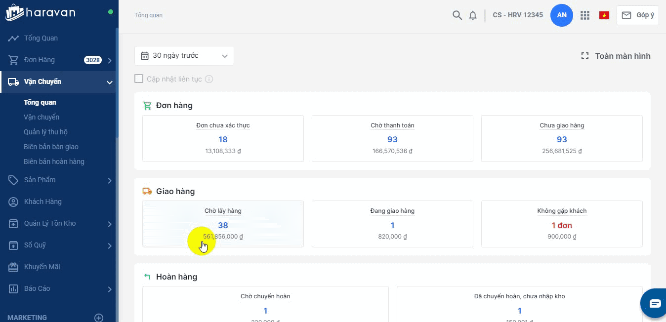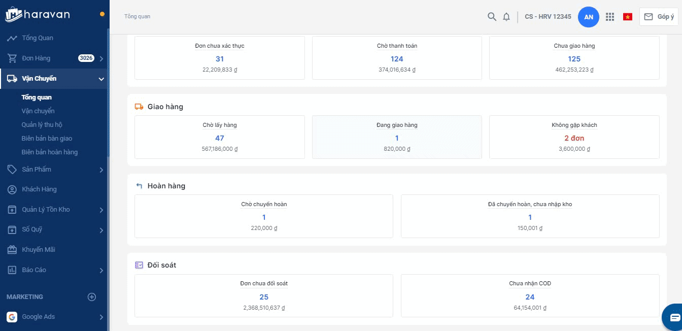 Trang tổng quan vận chuyển sẽ thống kê số liệu đơn hàng theo từng trạng thái trong quy trình vận chuyển. Các số liệu này sẽ giúp theo dõi những đơn đang bị chậm trễ trong quá trình đóng gói, giao hàng, các đơn đang có rủi ro hoàn hàng.