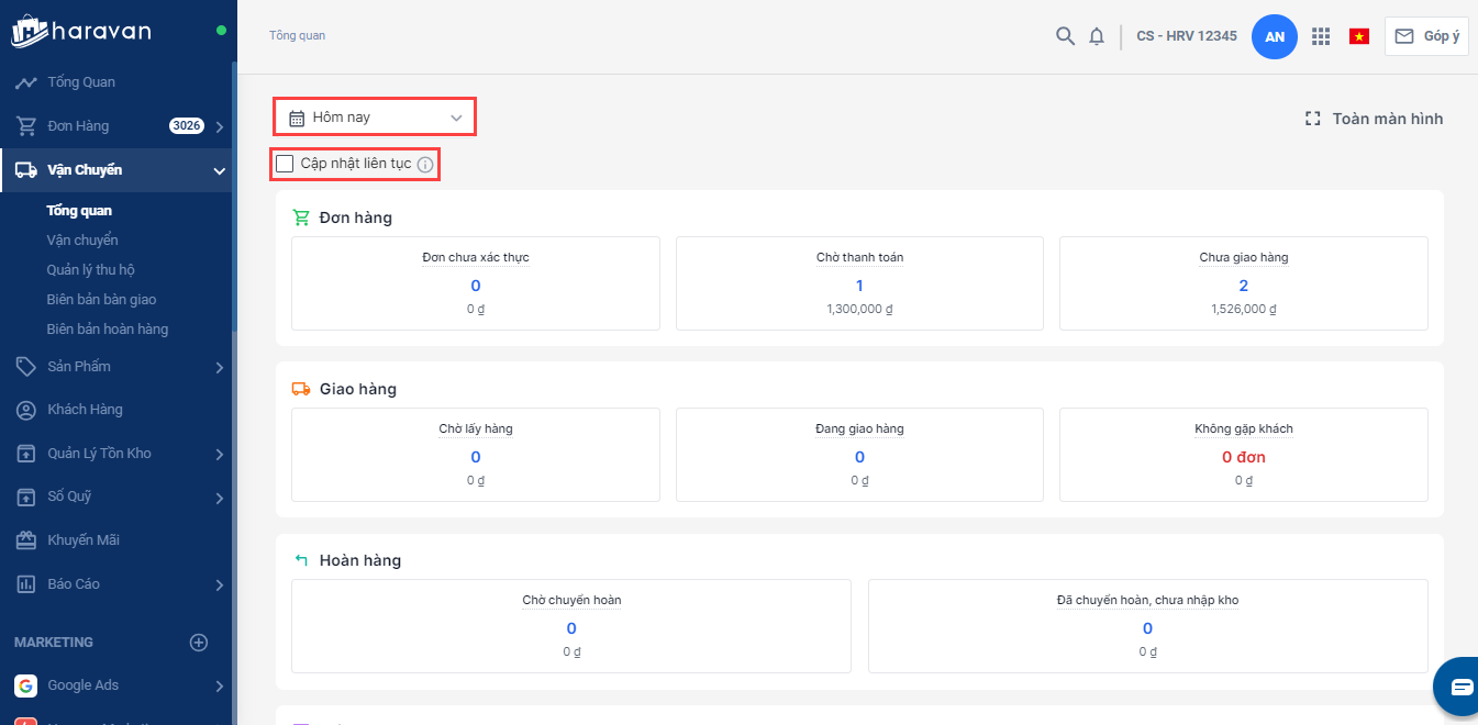 Trang tổng quan sẽ lọc đơn theo thời điểm đặt hàng được cập nhật theo thời điểm đặt hàng. Nếu bộ lọc là Hôm nay và chọn Cập nhật liên tục, hệ thống sẽ hỗ trợ cập nhật theo thời gian đặt hàng thực tế.