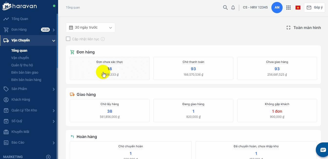 - Để xem chi tiết, bạn nhấn vào mục đơn chưa xác thực là sẽ điều hướng đến danh sách đơn hàng.