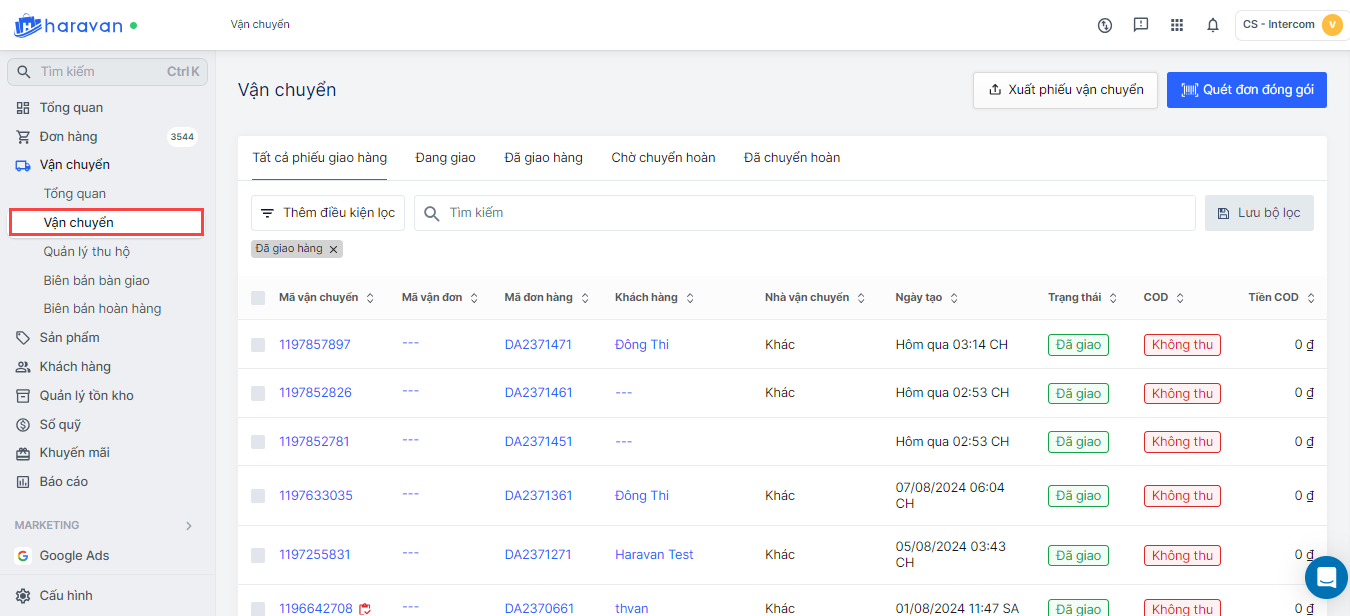 - Tại Trang quản trị, chọn Vận chuyển