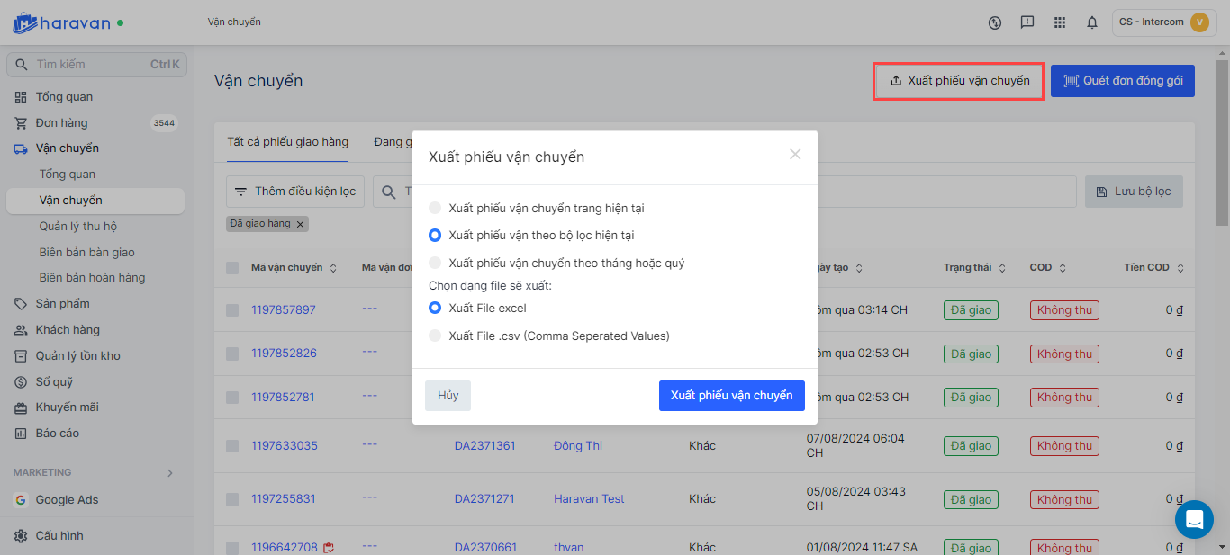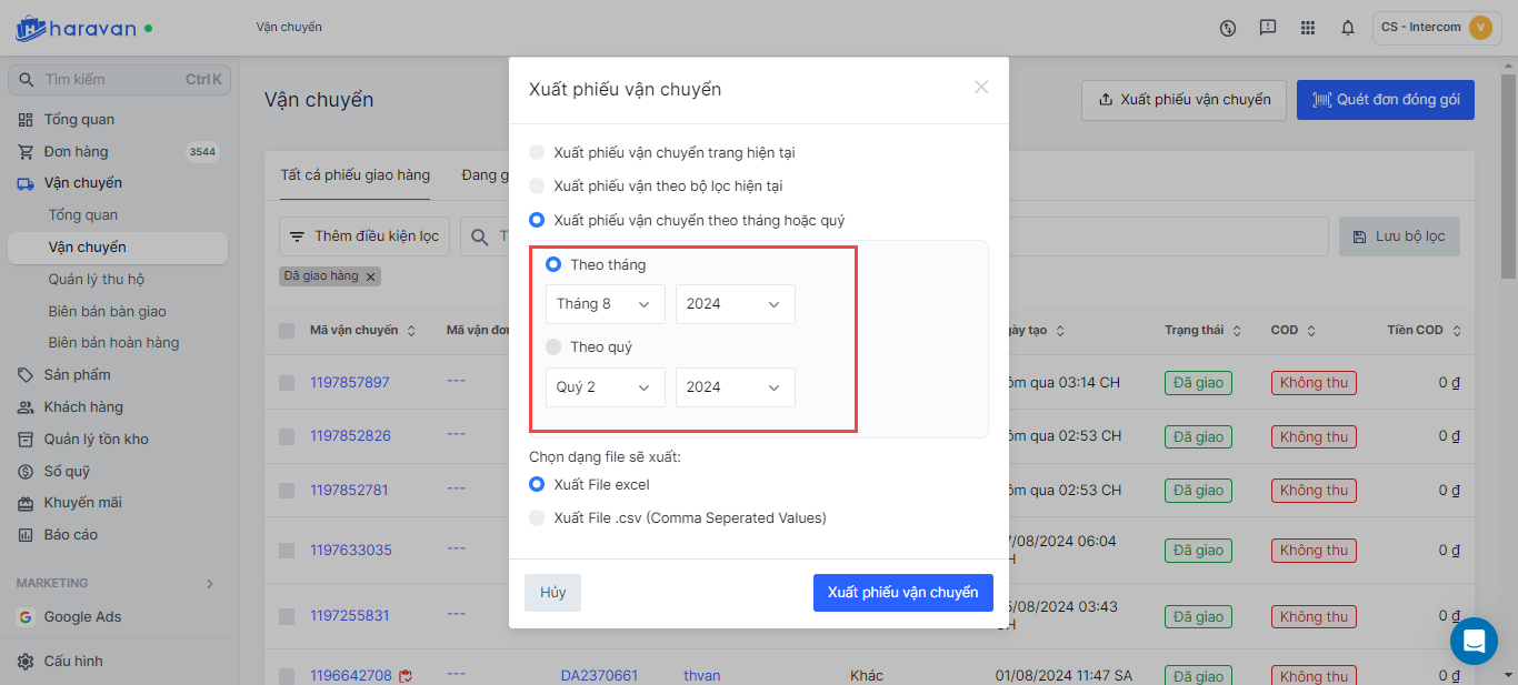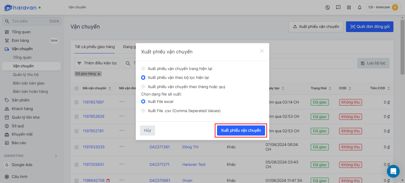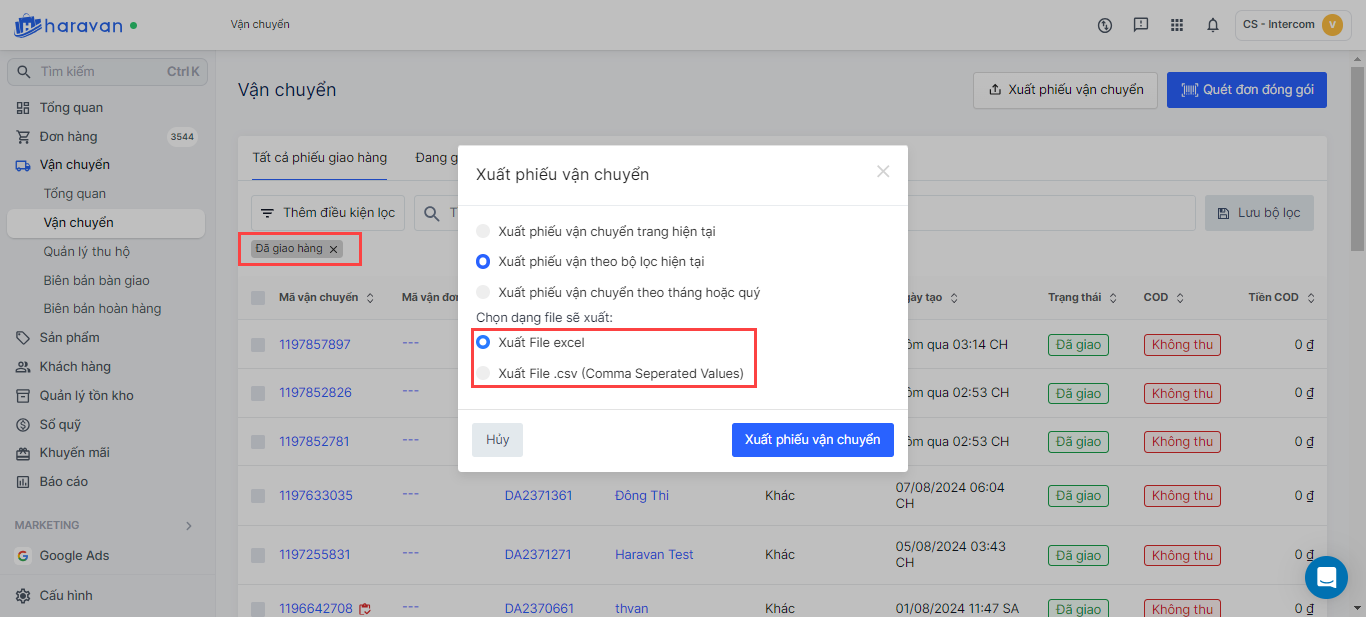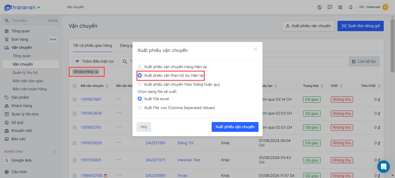 - **Theo bộ lọc hiện tại:**Nhà bán hàng phải thực hiện lọc phiếu vận chuyển trước khi chọn Xuất dữ liệu.