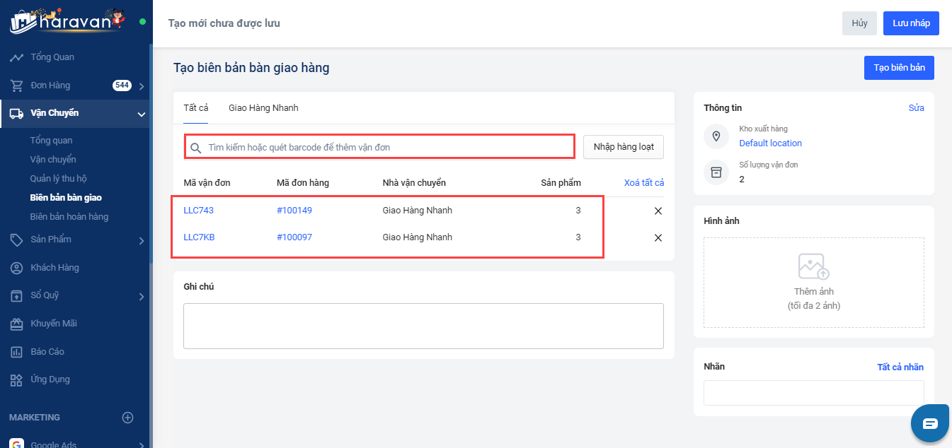 Bạn có thể tạo sẵn biên bản bàn giao trước khi shipper đến và Lưu nháp lại để xử lý sau