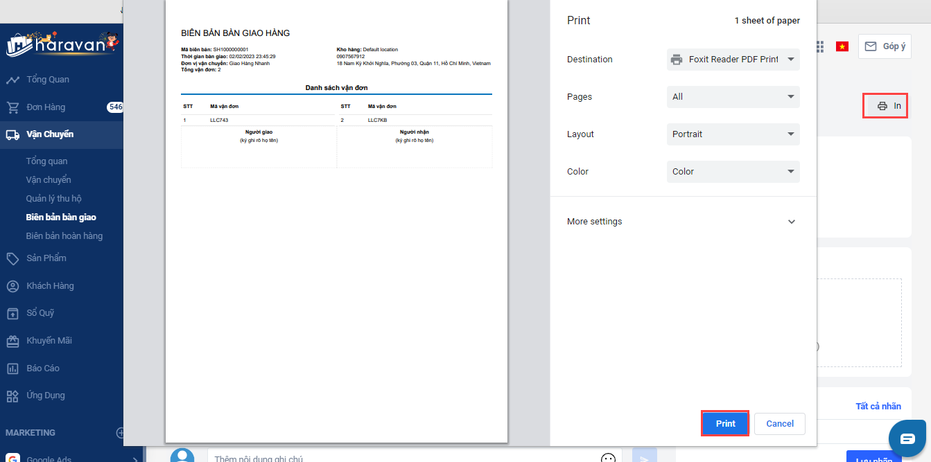 - ChọnInđể in biên bản bàn giao để shipper và nhà bán hàng thực hiện kí xác nhận