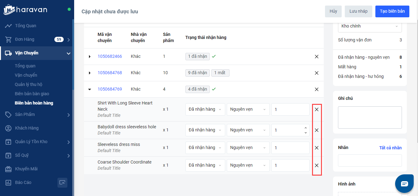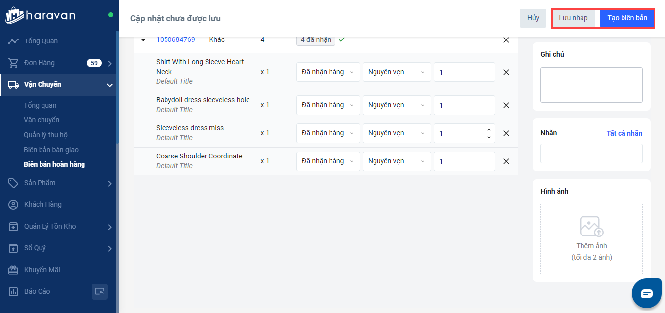 Sau khi bạn đã nhận đủ số kiện hàng shipper hoàn về, hãy thực hiện tạo biên bản: