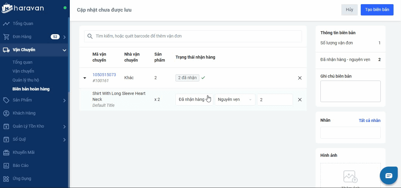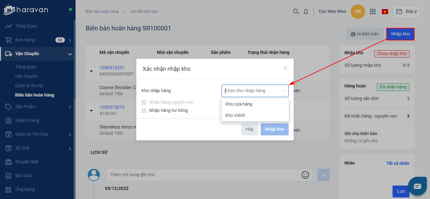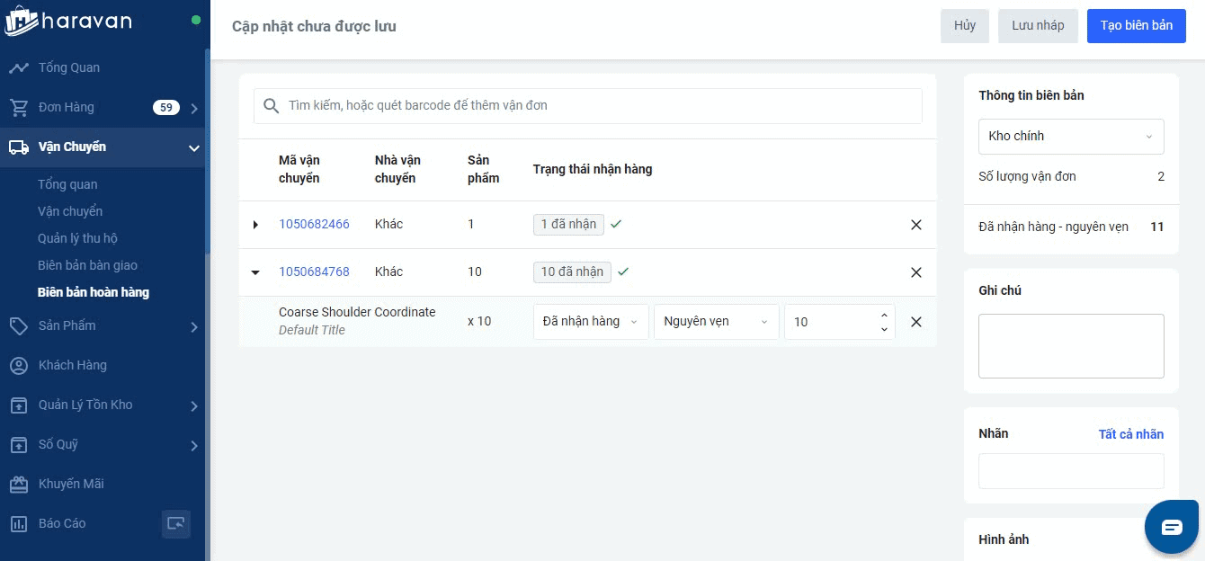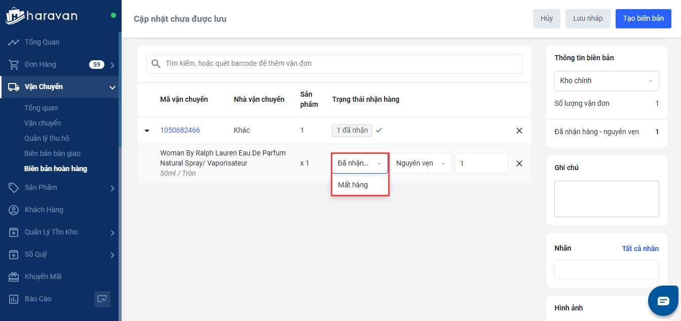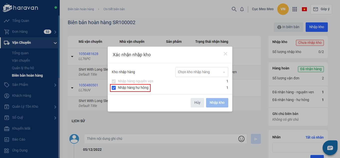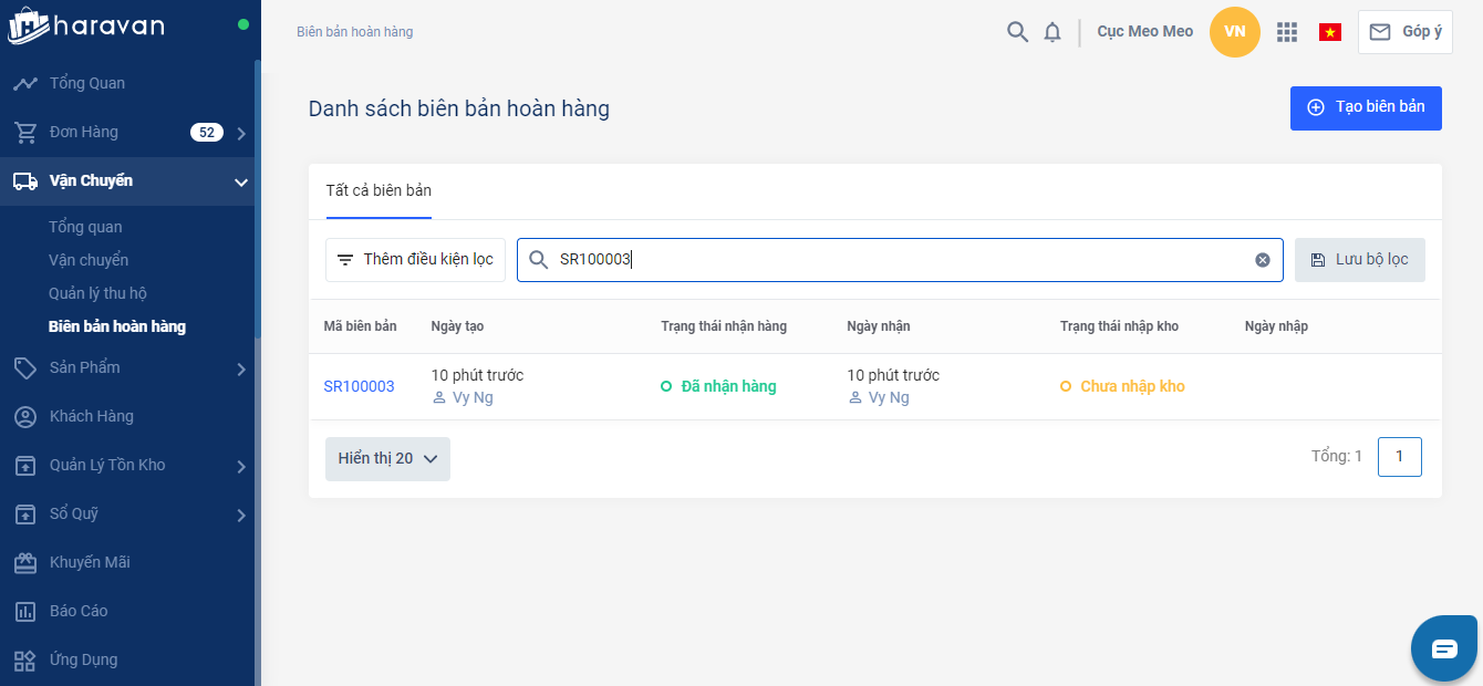 - Vào Trang quản trị → Vận chuyển → Biên bản hoàn hàng