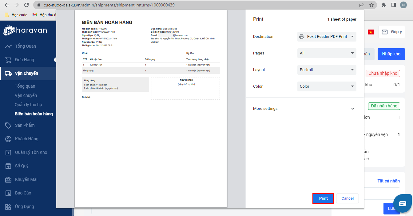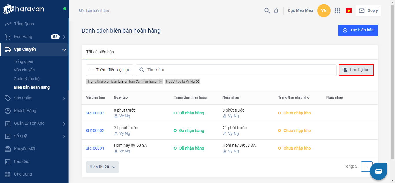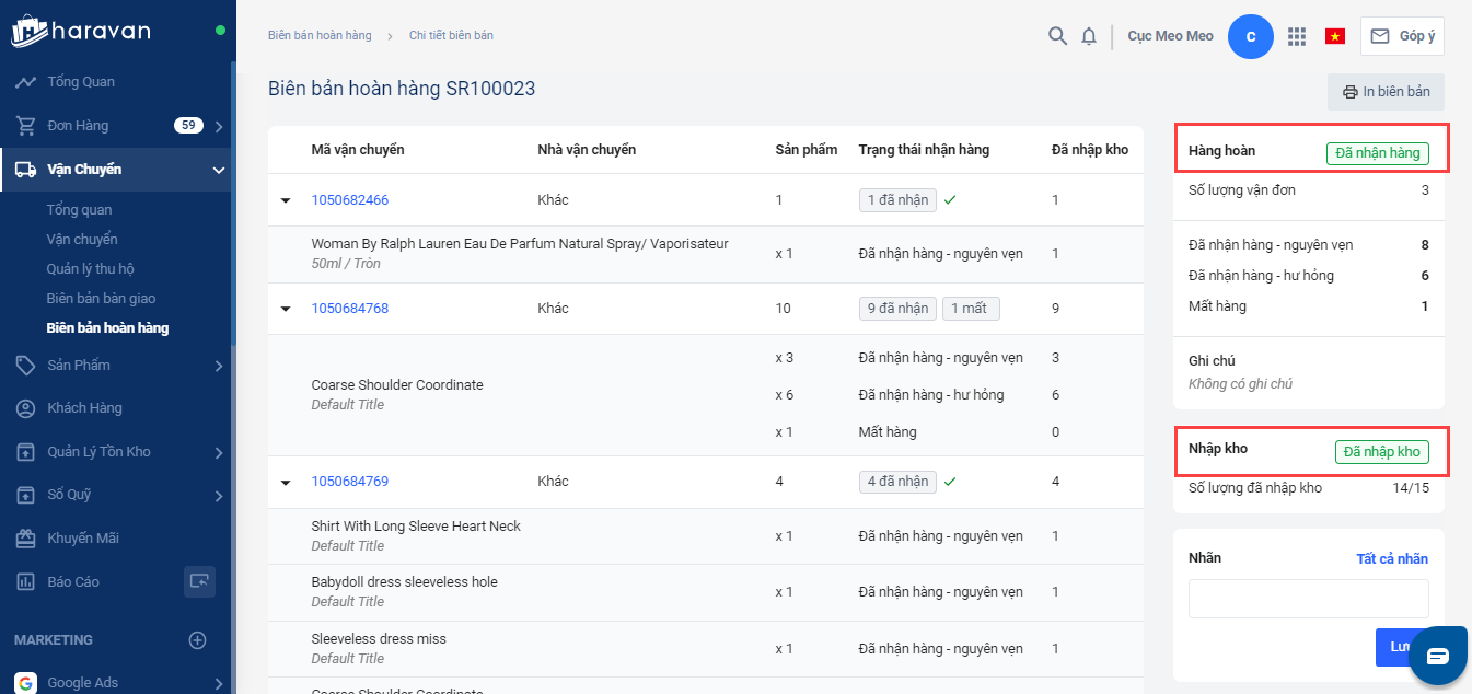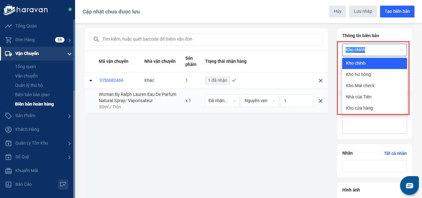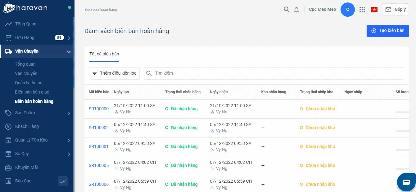 - Vào Trang quản trị → Vận chuyển → Biên bản hoàn hàng
