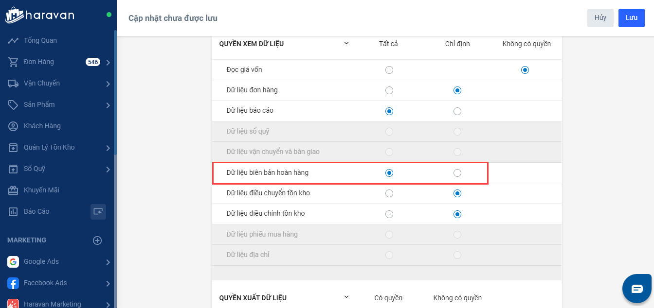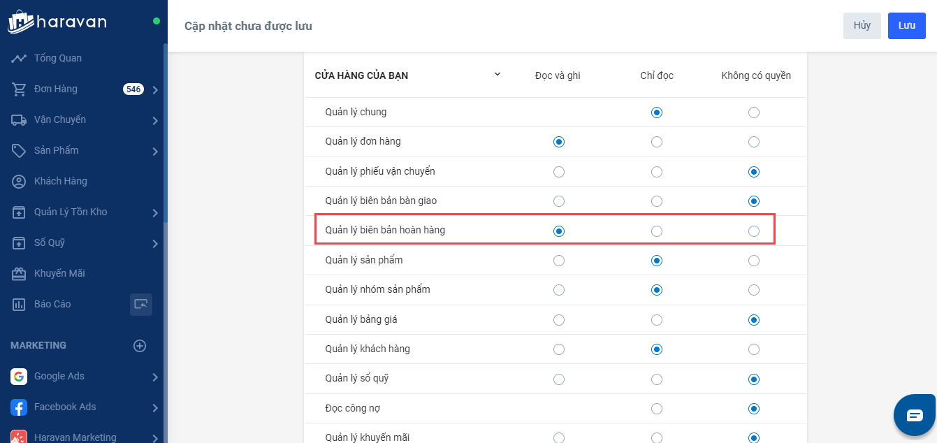 Hướng dẫn phân quyền tài khoản tạo biên bản hoàn hàng