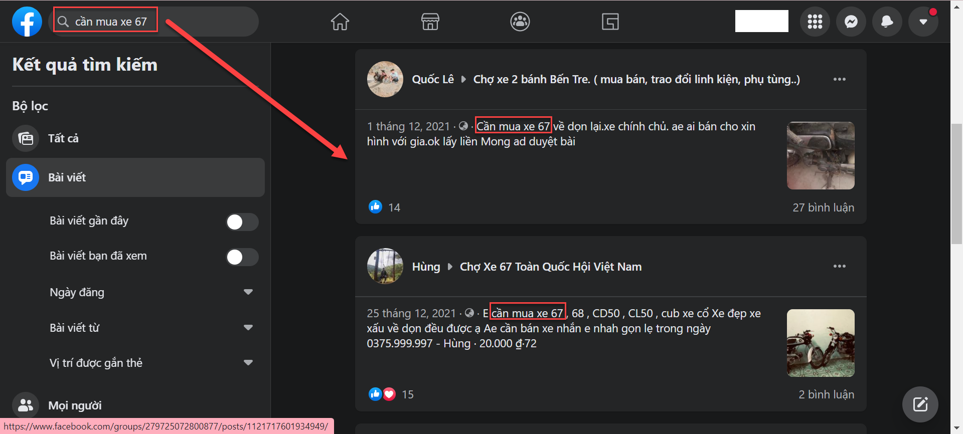 Ví dụ như mình bán xe 67, từ khóa tìm kiếm của mình sẽ là" cần mua xe 67", đây là kết quả, rõ ràng khách hàng của bạn xuất hiện ngay sau 1 cú enter: