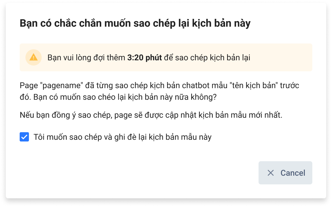 Nếu như bạn đã gắn kịch bản mẫu này trước đó, hệ thống sẽ ghi đè kịch bản mới lên kịch bản cũ và yêu cầu bạn xác nhận đồng ý sao chép lại kịch bản này.