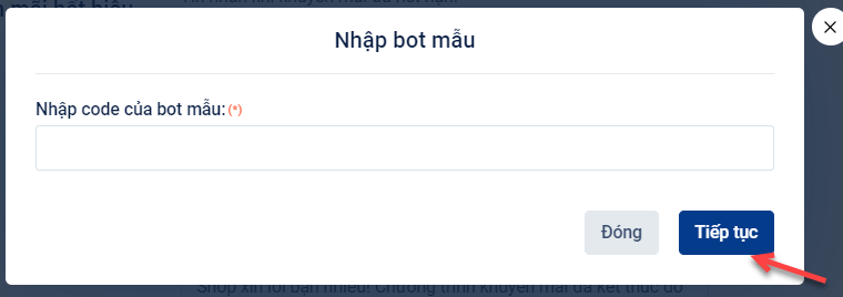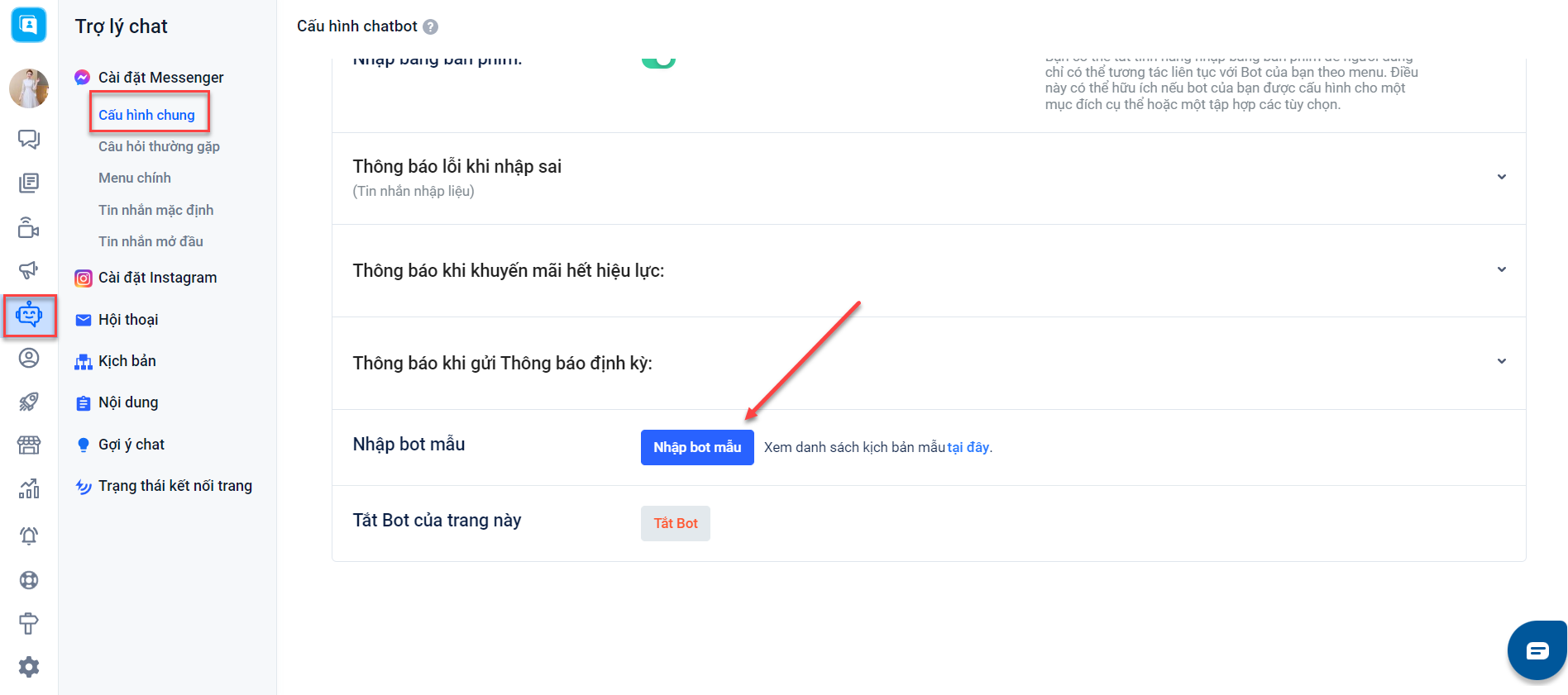 Bước 2: Bạn vào Harasocial, chọn Trợ lý chat → Cấu hình chung → Nhập bot mẫu → Thực hiện nhập code kịch bản mẫu vào hệ thống.