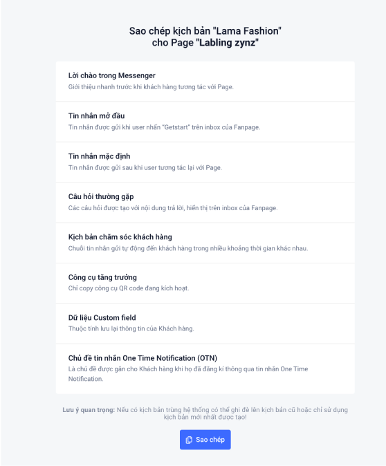 Đây là một tính năng giúp bạn dễ dàng sao chép toàn bộ kịch bản mẫu có sẵn theo Fanpage.
