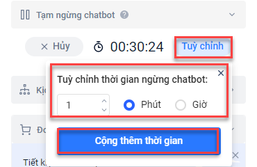 Trong trường hợp thời gian tạm ngừng chatbot đang đếm ngược mà nhân viên thực hiện tăng thêm thời gian thì thời gian sẽ được tính lại từ đầu = toàn bộ thời gian tạm ngừng chatbot đang chọn + thời gian vừa tăng.