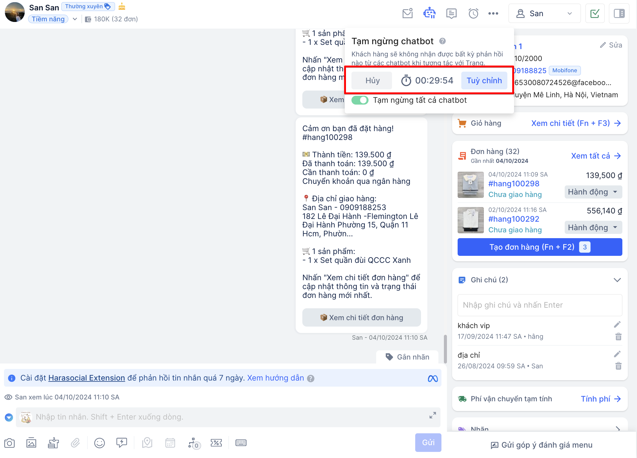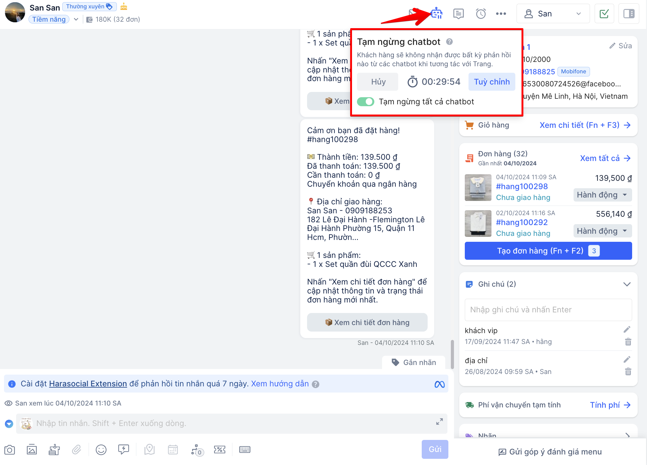 Thiết Lập Tính Năng Tạm Ngừng Chatbot HaraSocial