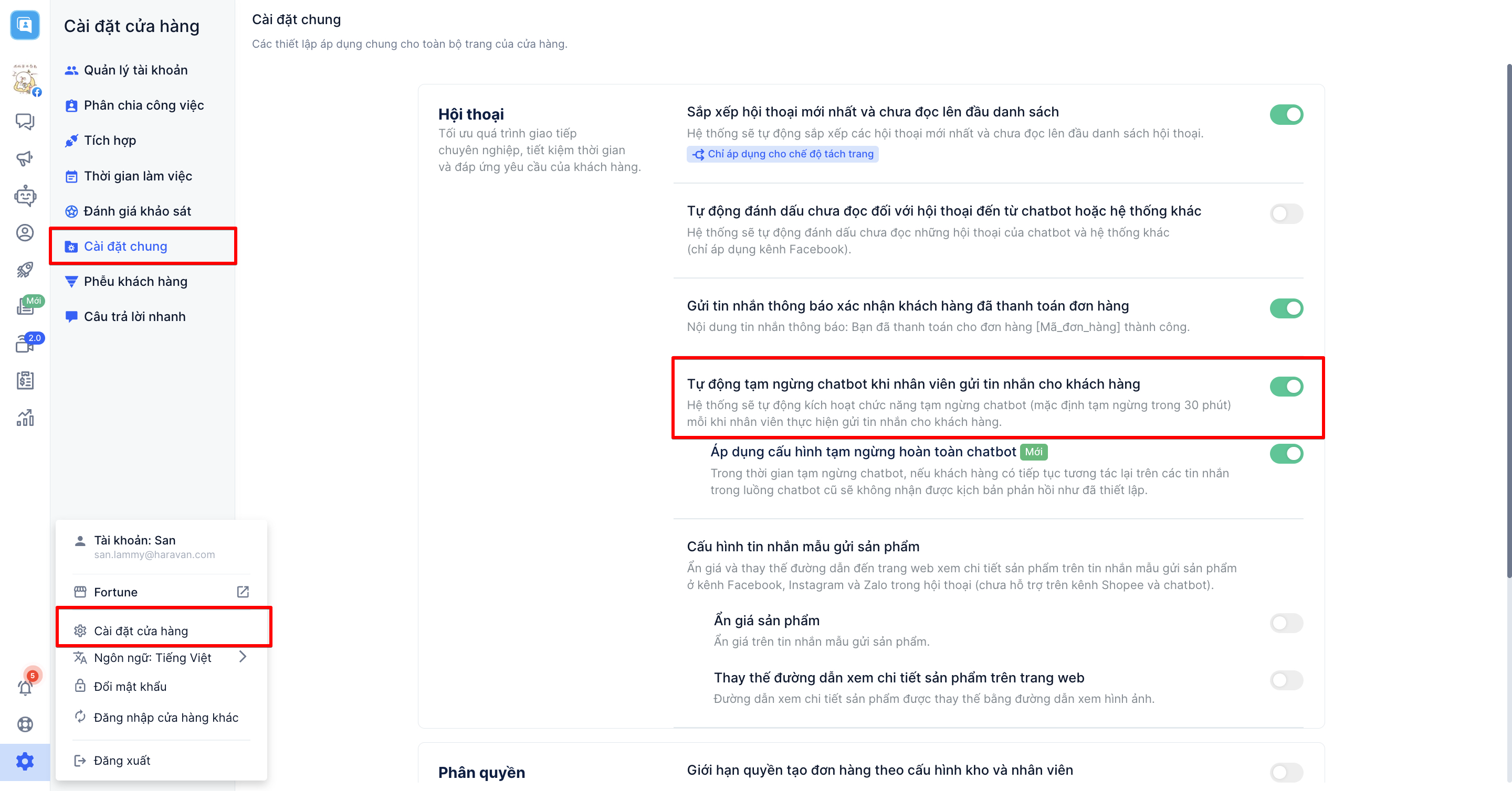 Truy cập C**ài đặt cửa hàng →**Cài đặt chung → Bật “Tự động tạm ngừng chatbot khi nhân viên gửi tin nhắn cho khách hàng”
